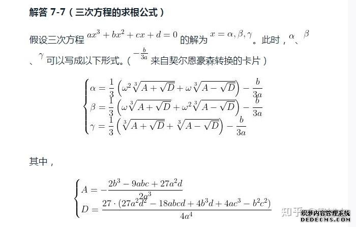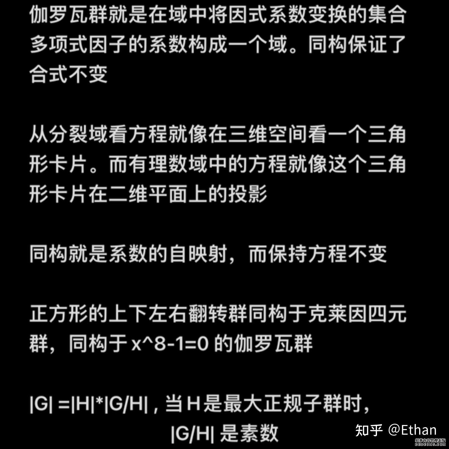 也就是说, N次代数方程等价于N个方程组,这个方程组不是线性的。我们要通过系数a反解出x 当然线性方程组这件事情是可以做到的,这就是线性代数里面学的。 非线性方程组一般是做不到的,这是感觉。但是我们的方程组有很好的形式,你观察就会发现,用x表示a的时候,a都是关于x的对称函数,也就是任意置换xi和xj,a都是不变的。例如 我们要回答,这样形式(Vieta's formulas)的方程组,能不能求解呢?超越普遍的非线性方程组,反解x呢? 毕竟三次方程和四次方程组都是可以求解的。我们截图给你们看看三次方程的求根公式,参考【数学女孩】这本书 ![]() 这种能不能的问题就是“池塘里面有没有鱼的问题”非常重要,非常漂亮,非常有挑战。 伽罗瓦的一生,参考【数学女孩】这本书,真的是天才的一生,因为他解决了上面这个问题。 ![]() 复杂的数学都是从简单的例子出发,别看数学家说得很普遍,他们的例子就是那么屈指可数的几个 考虑多项式方程, 我们再看多项式方程 我们再看 上面的三个例子其实说明了一件事情,就是第一个可以在有理数范围内实现因式分解,写成 所以我们知道了一件事情,一个多项式能不能实现因式分解,也就是说,写成 在这里你也可以看到,把 我们只需要在这样一个集合{ 我们有一个结论出现了,一个非常普遍的多项式, 我们把系数所处的域,就是系数所在的那个数的集合(满足加法和乘法封闭)记为Q 我们把所有的根都包含在内的那个最小的域,也是数的集合(满足加法和乘法封闭)记为E,这个E叫做这个多项式的分裂域。当然我们尽量不引入新的名词,因为每次说包含所有根的最小的数域,这个有点麻烦,我们就把他定义为多项式的分裂域 你想,如果对于普遍的多项式, |