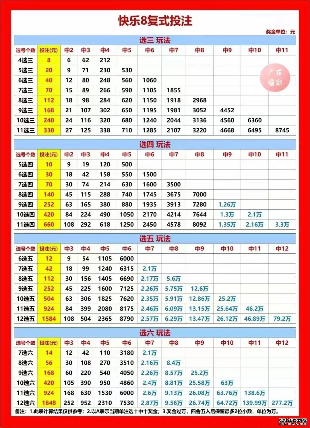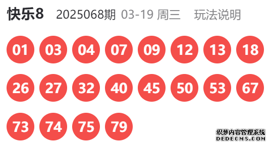 01 03 04 07 09 12 13 18 26 27 32 40 45 50 53 67 73 74 75 79 兑奖期限: --兑奖当期有效。中奖者应当自开奖之日起60个自然日内,持中奖彩票到指定的地点兑奖。逾期未兑奖视为弃奖,弃奖奖金纳入彩票公益金。  当期,“选十中十”中出0注,单注奖金500万元。“选九中九”中出2注,单注奖金30万元;“选八中八”中出19注,单注奖金5万元。详细中奖信息可点击→《快乐8游戏每期全国中奖情况》。快乐8游戏由中福彩中心统一开奖,每天开奖一次。每期开奖时,从1至80共八十个号码中随机摇出二十个号码作为当期开奖号码。快乐8玩法共包括“选一”“选二”“选三”“选四”“选五”“选六”“选七”“选八”“选九”和“选十”十种玩法。各玩法均支持单式投注、复式投注和胆拖投注。单注彩票金额人民币2元,购买者可对其选定的投注号码进行多倍投注,投注倍数范围为2-15倍。单张彩票的投注注数不得超过10000注。