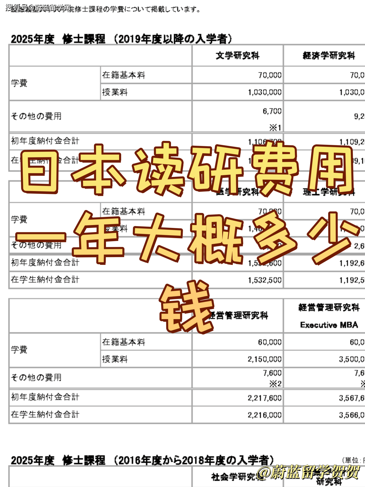 今天蔚蓝留学老师为同学们带来日本读研费用一年大概多少钱(研究生+修士),希望对计划申请去日本留学读研的同学们有所帮助。 日本研究生留学学费花费是比较少的,日本国公立大学研究生报名费9800日元,注册费84600日元,学费只要29700日元/月,国内大学生一般是夏季毕业,然后可以读日本大学当年10月入学的日本研究生,顺利的情况第二年四月考入日本修士,就这种情况来说,蔚蓝留学计算一下日本读研究生学费方面花费共计9800 + 84600 + 356400= 450800日元,合计人民币2.25万人民币,是日本语言学校学费的一半。可以看出日本研究生留学阶段学费是特别便宜的了。 蔚蓝留学贺贺老师说一下一般来说日本研究生主要是作为学生升入日本大学院的过渡阶段,目的是为了考入修士或者博士的,所以日本研究生也称作日本修士预科和日本博士预科。但是这种预科制度一般在日本国公立大学中比较常见,日本私立大学中并不多。