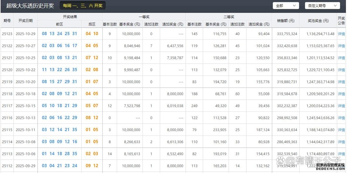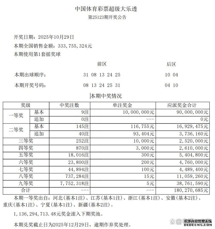 2025年10月29日晚,大乐透第25123期开奖结果揭晓。本期全国销售额高达3.34亿元,奖池更是蓄势待发,累计滚存11.36亿元。 ![]() 一、开奖号码:一副“不走寻常路”的牌 本期开奖号码前区为08、13、24、25、31,后区为04、10。若细看摇奖顺序,前区第一个球就跳出“31”,仿佛迫不及待想打破常规。 从整体看,前区号码呈现“头轻脚重”的格局:小号区(01-12)仅“08”一枚独苗,中号区(13-24)有“13”支撑门面,而大号区(25-35)则密集占据三席——“24、25、31”。 ![]() 更有趣的是,号码“24”和“25”组成一组连号,像一对携手闯关的“幸运搭档”。奇偶方面,前区以3奇2偶略占上风,后区则干脆打出“全偶组合”——04和10,冷静中带着一丝默契。 ![]() 二、中奖情况:头奖“雨露均沾”,追加竟“无人问津” 本期一等奖共开出9注,每注稳稳拿下1000万元。不过有意思的是,这9注大奖竟全部为基本投注,追加投注罕见“挂零”。看来这组号码不仅难倒了不少人,还让追求“1.8倍奖金”的彩民们扑了个空! ![]() 这9注大奖分布广泛,覆盖7个省份:河北、江苏、浙江、重庆、宁夏各1注,安徽和新疆成为本期“幸运双星”,各自收获2注。 二等奖的竞争则更为激烈:基本投注145注,单注奖金11.68万元;追加投注40注,每注多揽9.34万元。虽然与头奖失之交臂,但这份“安慰奖”也足够丰厚! ![]() 低奖级方面,三等奖至九等奖共派发超过900万注小奖,其中九等奖以775万余注成为“普惠之王”,完美诠释了“小奖暖人心”的彩票哲学。 ![]() 三、奖池与展望:11亿“巨款”待君采撷 本期派奖结束后,奖池仍稳稳驻守11.36亿元的高位。下期一等奖的总奖金预计将再攀高峰,足以支撑多注封顶大奖的诞生。 最后提醒所有幸运儿:本期兑奖截止日为2025年12月29日,中奖彩票务必妥善保管,可别让到手的“年终红包”飞走啦! 举报/反馈 |