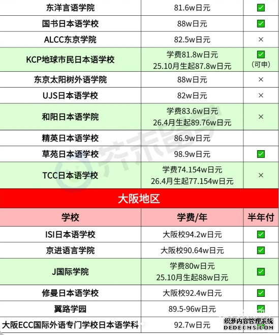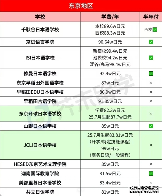 日本语言学校的学费的一般由报名费、入学金、学费、和杂费组成。 报名费:也叫检定料或选考料,一般在 2~3万日元之间,是一次性缴纳的费用,入学后无需重复缴纳。 入学金:不同学校收费不同,金额在5.5~10万日元之间不等,是第一学年入学时需要缴纳的费用。 学费:60~70万日元左右/年,由学校半年或一年为一个周期进行收取。 杂费:大约3~7万日元左右。 这些加一起就构成了语言学校的总体学费,目前一年平均在85w日元,合人民币4w左右。 虽然语言学校的费用上涨幅度不小,但是有的学校支持半年付,对于前期启动资金少的同学来说很适合! 今天就和芥末留学一起来了解一下2025年更新版的日本语言学校学费! ![]() ![]()