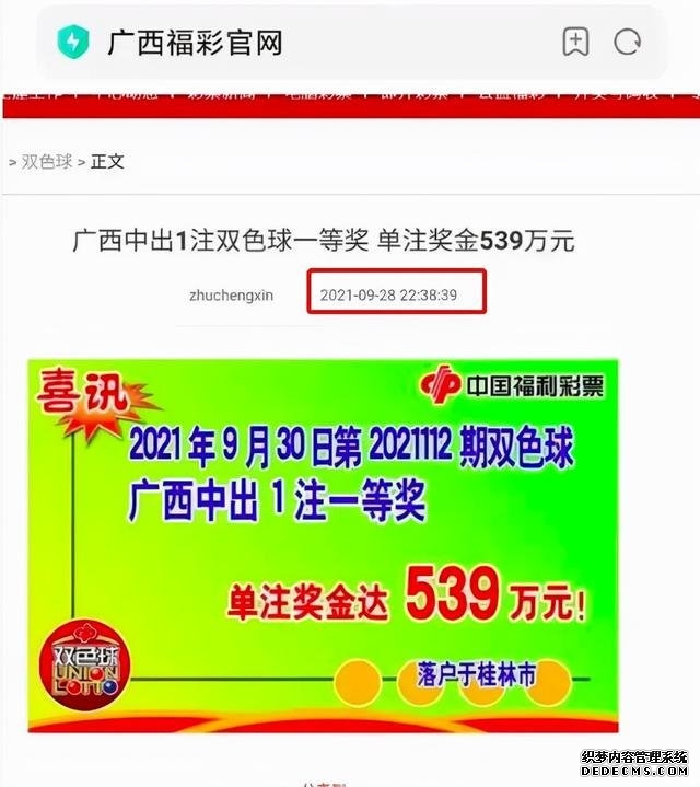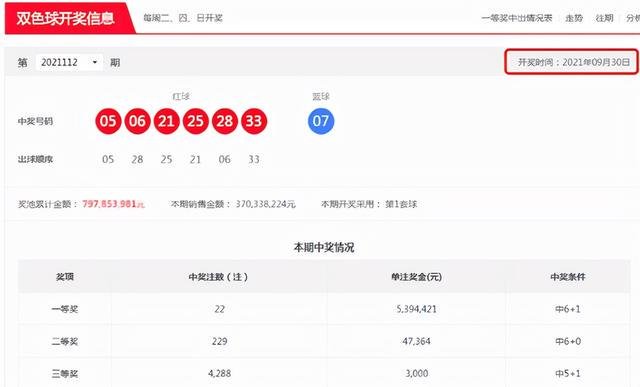 10月3日据红星新闻消息,近日有网友发现,本该9月30日公布的双色福彩开奖信息,竟提前两天出现在广西福彩官网上。这是福彩双色球第21112期,该期全国共开出22注一等奖,单注奖金约539万元,其中一注被广西一彩民中得。并有网民发现,该头奖信息,竟然在9月28日公布了,比开奖日提前了两天。