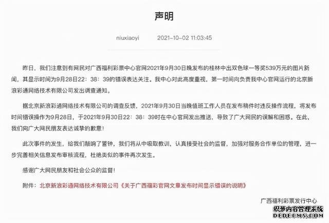 根据北京新浪彩通公司的调查反馈,2021年9月30日晚上,当班工作人员在发布稿件时违反了操作流程,将发布时间误操作为9月28日,并于2021年9月30日发布,导致了网民误解和困惑。广西福利彩票发行中心向网友们表示诚挚的道歉! 与此同时,北京新浪彩通还发布了一篇《广西福彩官网上文章发布时间显示错误的说明》。声明说,接到舆情后,该公司第一时间对问题进行排查,对文章的校对流程、发布流程、审核流程等进行回查,发现存在人为失误的可能性。
