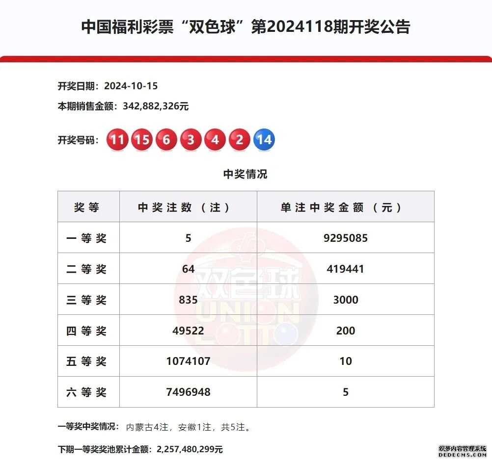 ![]() 双色球2024118期开出5注一等奖 10月15日晚,中国福利彩票双色球游戏进行第2024118期开奖。本期双色球头奖5注,单注奖金为929万元。 ![]()