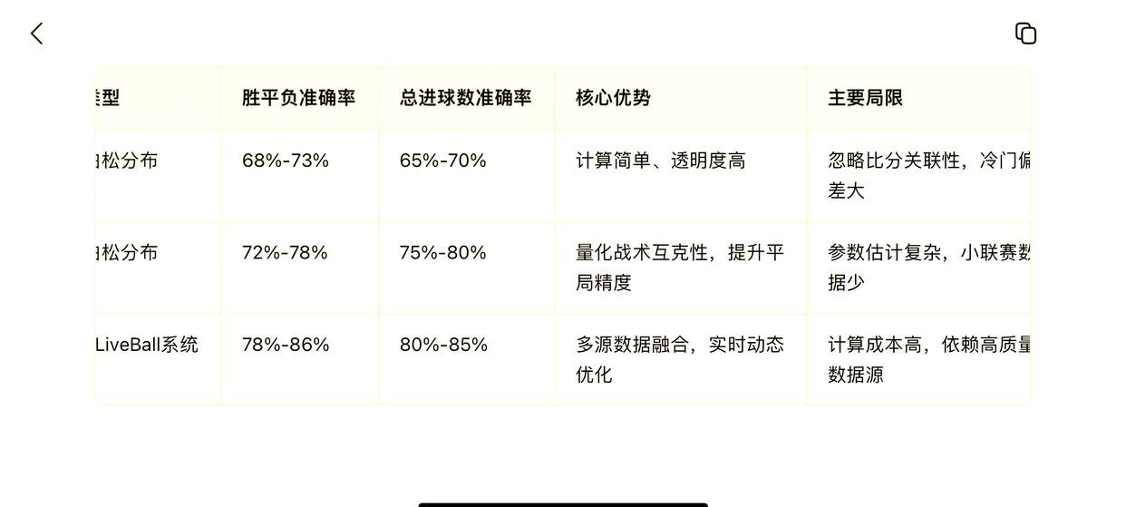01三模型策略的详细介绍 > 策略背景及优势采用三模型策略,我们对足球赛事的分析变得更为精准可靠。这一策略融合了多种数学模型和统计方法,通过对历史数据的深入挖掘,以及对赛事各方因素的细致考量,为我们提供了科学、客观的赛事预测。无论是实力对比、战术分析,还是球员状态、场地因素,三模型策略都能为我们一一剖析,助力我们更准确地把握赛事走向。 ![]() > 基础泊松分布模型在足球赛事分析中,我们采用了三种不同的模型来应对不同的分析需求。首先是基础泊松分布模型,它适用于快速估算,特别是在总进球数较少(如≤2球)的低复杂度场景下,但使用时需谨慎防范冷门情况。 > 二元泊松分布模型与WorldLiveBall系统其次,二元泊松分布模型在杯赛淘汰阶段展现出其独特价值,它的准确度高度依赖于参数λ₃的精细校准。最后,我们还有WorldLiveBall系统,它通过多模型堆叠和实时学习,成为了当前的最优解,能够将预测准确率提升至85%以上,但使用过程中需注意平衡计算成本与预测收益。 > 策略应用场景与注意事项在实际应用中,我们推荐采用“WorldLiveBall为主、二元泊松为辅、基础泊松验证”的三层策略。以80%为基准准确率,通过凯利公式合理控制投注比例,以实现长期稳定收益。值得注意的是,足球预测的本质在于概率博弈,即便是最先进的系统也无法完全消除不确定性。因此,在面对高概率事件时,我们仍需保持谨慎,确保对冲策略的有效性。 02布伦特福德与曼城比赛分析 > 比赛分析参数设定在分析布伦特福德与曼城的英超第7轮比赛时,我们首先需要基于球队数据来设定模型的核心参数。这些参数将直接影响我们对比赛结果的预测。 对于基础泊松分布模型,我们设定了布伦特福德主场预期进球为1.2,曼城客场预期进球为1.8。这样的设定考虑到了两队的历史数据和当前状态。例如,布伦特福德近期主场表现出色,但面对顶级球队时进攻效率可能会受到限制;而曼城客场防守存在漏洞,且周中还有欧冠比赛,体能状况可能受到影响。 此外,我们还引入了双变量泊松模型来进一步优化预测结果。在这个模型中,相关性参数λ₃被设定为0.2。这个参数反映了两队战术风格的差异,以及历史交锋情况对比赛结果的影响。由于布伦特福德主打防守反击和定位球,而曼城则以控球进攻为主,因此两队的进球序列相关性相对较弱。这可能会影响到比赛的具体进程和最终结果。 另外,我们还将利用WorldLiveBall系统来实时监测比赛情况。这个系统能够整合各种实时数据,包括球队阵容、伤病情况、场地条件等。通过这些实时数据,我们可以更准确地评估两队的实力和状态,从而做出更明智的预测。 在具体分析时,我们还需要考虑一些关键实时因素。例如,布伦特福德主场气氛狂热,这可能会给曼城带来一定的压力;而曼城需要适应人工草皮,这可能会影响到他们的发挥。此外,如果曼城能够早进球,他们可能会更快地掌控比赛节奏,从而取得更好的结果。这些因素都需要我们在预测时进行充分考虑和评估。 > 三种模型分析结果对比基于先前设定的参数,我们进行了胜平负和总进球数的概率计算。利用基础泊松分布模型,我们得出曼城胜出的概率最高,达到58.7%,平局的概率次之,为23.7%,而布伦特福德爆冷的概率相对较低,为17.7%。在总进球数的预测上,我们发现2-3球是最可能出现的场景,概率为50.3%,这恰恰反映了曼城强大的进攻能力和布伦特福德在防守方面的漏洞。 > 风险最小化对冲策略设计基于上述共识,我们设计了风险最小化的对冲策略。主要投资高概率选项,同时辅以平局和冷门选项的防护,通过这样的组合投注来覆盖潜在风险。在投注比例方面,我们采用半凯利策略进行优化,确保单笔风险控制在15%以内,并参考市场典型赔率进行决策。 此外,我们还将根据WorldLiveBall系统提供的实时数据动态调整策略方案。通过预期盈亏的测算,我们发现最优场景是曼城以2-1的比分胜出,这将带来大约150%的总收益;而最差场景是布伦特福德以1-0的比分取胜,但我们的损失将控制在8%以内,这主要是由于布伦特福德胜出时的高赔率部分可以覆盖我们的损失。总的来说,我们的策略在平均预期收益方面为正,且最大回撤率控制在10%以内。 > 执行要点与风险控制核心逻辑验证: