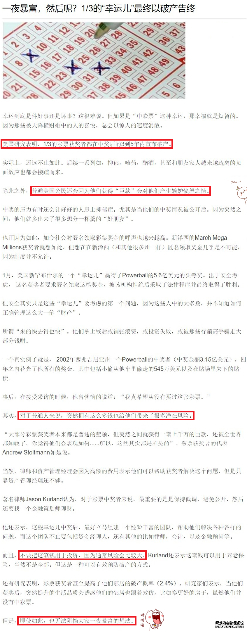 那你肯定要问了,之前就是千万富翁,又中了亿万彩票,人生应该一片坦途,为什么说他愚蠢呢? 1.Andrew在获奖后第一件事就是把奖金的10%捐献给教堂,超过1000万美金的捐赠,其中一位受捐者甚至在飓风区拿着这笔钱建了价值百万美金的教堂 2.Andrew继续捐赠1400万美金建立了自己的基金会,为低收入家庭提供食物和衣服 3.Andrew捐赠给他买彩票的便利店的收银员一套12万美金的房子,一辆Jeep大切诺基和44000美金的支票 4.Andrew开始大量地在赌场和脱衣舞俱乐部花钱 5.Andrew因为有平时大量携带现金的习惯,2003年小偷从他的车里偷走54万美金,然后这没让他吸取教训,小偷之后又从他的车里偷走20万美金 ![]() 6.Andrew开始大量得赠予周围的亲友财务 1.2004年9月,Andrew孙女的男友在他家中服用过量毒品身亡 2.2004年12月,Andrew的孙女也死于毒品吸食过量,在临死之前,她说:希望Andrew永远没中那张彩票 3.2005年,Andrew被赌场起诉出千,赔偿赌场150万美金 ![]() 4.2009年,Andrew的女儿在抑郁中去世 5.2016年,Andrew家中失火,房屋完全被烧毁,同时Andrew还没有对房屋进行投保,他对记者坦承自己已经没钱了,面临无家可归。 ![]() 这样那样的不幸加起来,Andrew把自己的人生彻底搞砸了,一个千万富翁在中了亿万的彩票后把居然把人生搞砸了?! 1.大把金钱挥霍在赌场和脱衣舞俱乐部上,他本可以把奖金用于投资,增加被动收入 2.对金钱的态度异常疏忽和慷慨,仅在车里就被偷了近百万美金,仅捐赠就捐了超过2000万美金 3.赌瘾成性,已经以2.92亿的赔率赢得了彩票,在需要在赌场上证明什么呢?反复证明自己的运气么? 4.给予亲友无节制的礼物和现金,而自己的孙女却把其中大量的钱财花在毒品上 欢迎关注,我的更多有趣有料的知乎回答: 知乎用户:办信用卡哪家银行好? 知乎用户:有100w左右的现金,有什么好的理财方式? 知乎用户:信用卡取现,然后存支付宝吃利息,月底再取出还信用卡,有可行性嘛? 知乎用户:保险公司的套路有哪些? 知乎用户:余额宝利率一跌再跌说明了哪些问题? 知乎用户:买二手房需要注意什么? 知乎用户:如何选购银行的理财产品? 使用支付宝“花呗”,微信“借钱”,京东“白条”会影响个人征信记录吗? 知乎用户:支付宝芝麻信用分 750 以上的都是些什么样的人?为何经常买买买都不到700? 超NB的微信插件——微信小助手 (你要的功能全都有) 假如中国放开户籍制度,允许人口自由流动,会产生怎样的后果?会有怎样的深远影响? (责任编辑:admin) |