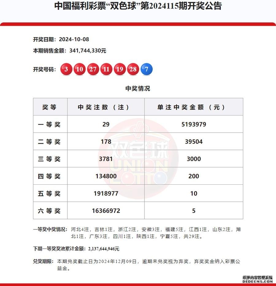 ![]() 双色球开奖 10月8日晚 中国福利彩票双色球游戏 第2024115期开奖 本期双色球开奖号码为 红球:3 10 11 19 27 28蓝球: 7 一等奖 中出29注,单注奖金为519万余元 中奖情况: 河北4注,吉林1注,浙江2注,安徽3注,福建5注,江西1注,山东2注,湖北1注,广东3注,四川1注,陕西1注,宁夏5注 二等奖 中出178注,单注奖金为3万余元 六等奖 中出1636万余注 本期销量 3.41亿余元 筹集公益金 1.23亿余元 下期一等奖奖池累计金额 21.37亿余元 福彩双色球 每周 [ 二、四、日 ] 开奖 欢迎光临福彩站 为梦想投注,为公益加油 扶老 助残 救孤 济困 温馨提示:理性购彩量力而行 ![]() (来源:“中国福彩”微信公众号) 新闻线索报料通道:应用市场下载“齐鲁壹点”APP,或搜索微信小程序“齐鲁壹点”,全省800位记者在线等你来报料! 举报/反馈 |