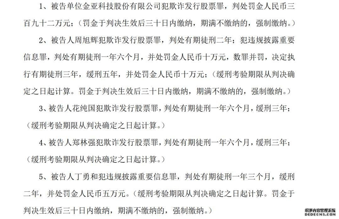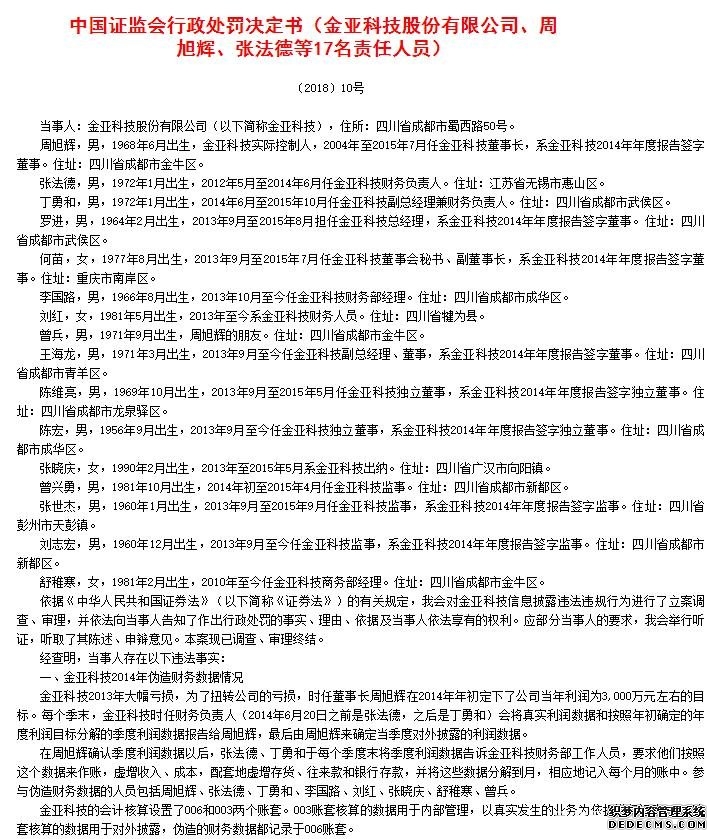 ![]() (图片来源:视觉中国) 2009年10月30日,金亚科技在深圳证券交易所挂牌交易,获准公开发行股票人民币普通股(股票代码:300028)3700万股,当时募集资金净额人民币3.9186亿元。 2018年6月25日,金亚科技发布公告称,因涉嫌欺诈发行股票等违法行为,实控人周旭辉已于近日被证监会移送公安机关。 2020年5月14日,金亚科技被深交所决定终止上市,2020年8月3日,金亚科技股票被交易所摘牌。2021年3月,周旭辉被判罚金392万,实控人获刑三年。 ![]() 2009年10月30日,金亚科技登陆资本市场,是创业板首批28家上市公司之一,被称为“电视游戏第一股”。2009年上市首日,收盘价格35元,涨幅超过200%,在28家企业中排名第一。2015年市值曾高达180亿。 在2015年6月4日晚,金亚科技发公告称,因公司涉嫌证券违法违规,证监会决定对公司进行立案调查。到2016年1月27日,公司实际控制人周旭辉也因涉嫌违反证券法律法规而被立案调查。 2017年11月14日晚,金亚科技发布公告,公司及周旭辉、张法德、丁勇和、罗进、何苗、周良超、李国路、刘红、曾兵、王海龙、陈维亮、陈宏、张晓庆、曾兴勇、张世杰、刘志宏、舒稚寒收到《行政处罚及市场禁入事先告知书》。 至此,金亚科技上市后的财务造假细节曝光。 原来因2012、2013年金亚科技业绩大幅亏损,为了以表决心,董事长周旭辉承诺2014年全年利润要达到3000万。而本就不佳的业绩要达成3000万这个目标,并不容易,周旭辉决定通过财务造假来“做”业绩。 每个季度末,金亚科技的财务负责人会将真实地财务情况报告给周旭辉,再由周旭辉下达指令确定对外披露的数据,要求财务部工作人员按照对外数据来作帐,虚增收入、成本,配套地虚增存货、往来款和银行存款,并将这些数据分解到月,相应地记入每个月的账中。 金亚科技的会计核算设置了006和003两个账套,一本对外,一本对内。 坚持了一年后,金亚科技披露2014年年报,业绩不仅扭亏为盈,净利润甚至高达2577万元,同比增长121.24%,3000万的“小目标”险些达成。 ![]() 《处罚决定书》显示,金亚科技通过虚构客户、伪造合同、伪造银行单据、伪造材料产品收发记录、隐瞒费用支出等方式虚增利润。经核实,金亚科技2014年年报合并财务报表共计虚增营业收入7363.5万元,虚增营业成本1925.3万元,少计销售费用368.5万元,少计管理费用132万元,少计财务费用795万元,少计营业外收支1315万元,虚增利润总额8049万元,占当期披露的利润总额的比例为335.14%,并使利润由亏损变为盈利。 不仅如此,金亚科技还对建设工程合同进行造假,虚增银行付款单据,增加了3.1亿元预付工程款。同时,还虚增银行存款2.18亿元,占当期披露的资产总额的比例为16.46%。 ![]() (造假细节披露后,金亚科技股价狂跌,2018年8月7日收盘价仅有0.77元) ![]() 2018年3月7日,证监会决定对金亚科技给予警告,并处以60万元的罚款;对周旭辉给予警告,并处以90万元的罚款,其中作为直接负责的主管人员罚款30万元,作为实际控制人罚款60万元。另外,对张法德、丁勇和等人给予警告,并分别处以10万元至30万元不等的罚款。 此外,对周旭辉采取终身证券市场禁入措施,对张法德、丁勇和分别采取10年证券市场禁入措施,对罗进、何苗分别采取5年证券市场禁入措施。后在2018年8月10日,证监会网站披露对立信会计师事务所及两位注册会计师的行政处罚决定,没收立信业务收入90万元,并处以270万元的罚款;同时,对邹军梅、程进给予警告,并分别处以10万元的罚款。 ![]() 周旭辉,1968年生,1988年毕业于浙江大学机械设计专业。曾在成都电视联合集团公司、成都金丰无线电厂任职。除了信披违法、造假上市,更早让周旭辉出名的,是在离婚中追求比自己小一轮的,在电视剧《亮剑》中扮演李云龙老婆田雨的女演员童某,二人后续如愿结婚。 在证监会处罚决定书下达后没多久,2018年7月,金亚科技的实际控制人周旭辉因涉嫌欺诈发行股票罪被四川省公安厅直属公安局刑事拘留。 ![]() 2021年3月,金亚科技公告称收到四川省成都市中级人民法院发来的(2020)川01刑初323号《刑事判决书》及相关法律文书。法院对公司、周旭辉等人涉嫌欺诈发行股票罪、违规披露重要信息罪等事项已审理终结并作出一审判决。 法院查明,2008年至2009年7月期间,被告人周旭辉作为金亚科技的股东、董事长及实际控制人,为使公司在A股顺利上市挂牌交易,以公司名义授意时任财务总监花纯国、销售经理郑林强等人进行财务数据造假,并要求公司其他部门员工予以协助配合,虚增、夸大公司2006年度至2008年度以及2009年第一、二季度营业收入及盈利能力。 公司在向中国证券监督管理委员会提交的《首次公开发行股票并在创业板上市招股说明书》等文件中使用上述虚假数据,隐瞒公司真实经营状况。后经中国证监会核准,公司于2009年10月30日在深圳证券交易所正式挂牌交易,获准公开发行股票人民币普通股(股票代码:300028)3700万股,募集资金净额人民币3.9186亿元。 此举,构成欺诈发行股票罪的犯罪事实。 金亚科技2013年大幅亏损,为扭转公司亏损,时任公司董事长周旭辉授意时任财务总监丁勇和进行财务数据造假,通过虚构客户、伪造合同、伪造银行单据、伪造材料产品收发记录、隐瞒费用支出等方式虚增利润。2015年4月1日,公司依据虚假的账套核算数据对外披露了《金亚科技股份有限公司2014年度报告》。 该行为,构成