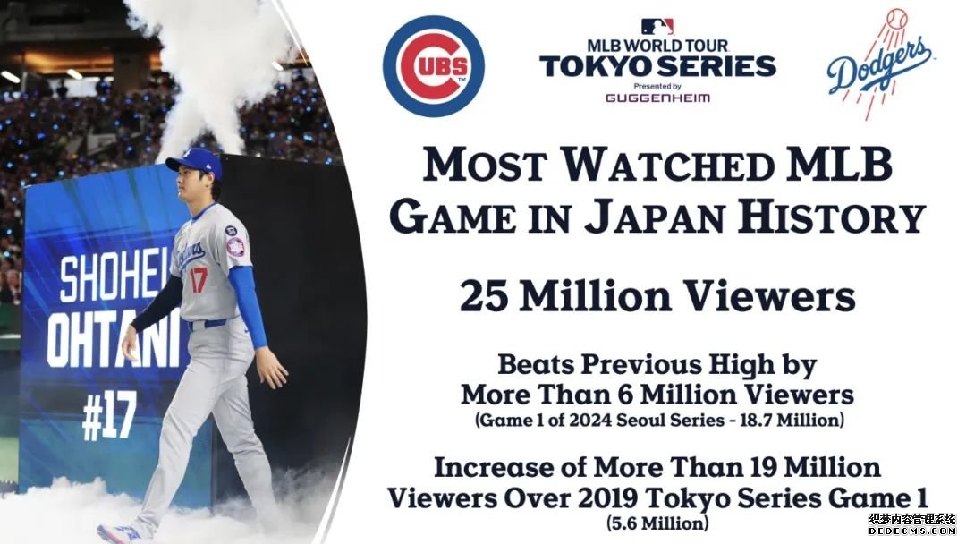 MLB东京赛赞助商名单,图片来自Sportsbusinessjournal。 道奇与小熊的东京揭幕战第一战,各平台直播收视人数达到2500万,创下了MLB比赛在日本的收视新高,比2024首尔系列赛第一战高出600多万观众,比2019年东京赛第一场高出1900万观众。其中在关东地区,此战缔造强劲的收视率,家庭收视率达到31.2%(个人19.9%),最高峰时段出现在晚间8点半,达到35.7%,也就是道奇第5局反攻拿下3分的时段,大谷翔平与队友连续安打超前小熊。这场比赛的收视率超越先前道奇vs读卖巨人的热身赛,当时为22.9%,今年的收视率仅次于年初《箱根驿传》(全称:东京箱根间往复大学驿传竞走)的28.8%。现在MLB大联盟的揭幕战登上日本今年收视最高的节目了。 道奇与小熊的东京揭幕战第二战,各平台直播收视人数也有2300万,是MLB在日本收视第二高的比赛。这两场比赛平均收看人数达到2400万,成为MLB历史上平均收视最高的日本系列赛。道奇与读卖巨人的表演赛全平台收获1800万直播观众,成为MLB在日本收视最高的表演赛。此系列赛在美国市场也有着出色的收视表现,其中第一场在Fox平台拿下了83.8万的平均观看人数,这是MLB将新赛季开幕相关比赛放在亚洲时的最佳数据。 日本关西大学名誉教授宫本胜浩赛前进行分析,热身赛和正赛预计合计带动40亿日元的经济效益,其中热身赛约占16亿日元,正赛约24亿日元。另外,他提到,若大谷翔平能击出全垒打,这种经济效益将可能扩大,未来包括网络竞拍、广告效益都会因此加成,估计经济效益可增加1亿至2亿日元。如文章开头所述,大谷翔平打出了全垒打,按照宫本胜浩的预计,此次系列赛的经济效益走向满格,达到41亿日元到42亿日元。总之,这个系列赛在方方面面都是现象级的表现。 在美国,上一次MLB赛事转播吸引超过2500万人是什么时候?那恐怕得追溯到2017年太空人对战道奇队比赛的第七局了。去年世界大赛道奇队和扬基队的比赛平均收视只有1510万人;2023年游骑兵队对阵响尾蛇队的比赛,更是在Fox平台上创下了1973年以来平均观看次数最少的纪录,只有908.2万观众。这一对比,在一个事实的衬托下更为刺眼——日本人口只有美国的三分之一。 众所周知,棒球在日本,就相当于NFL在美国,而刚刚举行的MLB东京系列赛也就相当于举办了一场”超级碗“。的确,棒球在日本要比在美国更受欢迎。2023年世界棒球经典赛(WBC)3月22日的决赛,日本队以3:2战胜美国队夺冠,创造了WBC收视率纪录。这场比赛在日本的收视率极高,在日本朝日电视台实时转播日本队击败美国队夺冠的瞬间,关东地区最高家户收视率达到了46%,关西地区也达到了44.6%,超过了东京奥运会期间的所有比赛。 大谷翔平和山本带领的道奇队赢得了2024 年世界大赛,这场比赛在日本吸引了创纪录的八位数观众,达到1515万人,创下了当时日本MLB电视转播纪录。因为球迷蜂拥而至,想要一睹这对组合的精彩表现,日本职业棒球联赛(NPB)甚至在自己的日本大赛决赛期间,贡献出黄金时段来播这场道奇队的比赛。日本和加州17个小时的时差,让这些数字更加耀眼。 从球员人数来看,2022 年,来自日本的美国职业棒球大联盟球员人数为 7 人,这一数字现在上升到了15,这意味着在不到三年的时间里,日本球员人数增长了近 100%。近年来,这一渠道不断加强,跨越太平洋的人才水平也越来越高。