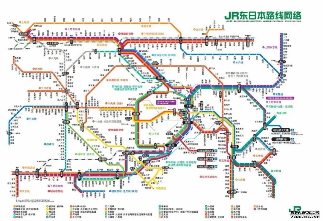 密集的JR东日本城际线路 日本JR从上世纪60年代开始,就在城际之间推行更为便捷和快速的轨道交通,包含了“新干线”(高铁)、特急车(特快车)、新快速(快速列车)、普快(普通客车)以及类似地铁的市内电车等系统。 这其中较为知名的当属“新干线”,也是全世界首条商业运营的高速铁路系统。 日本技术也先后输出到英国、意大利、美国以及中国。 1964年,日本JR投资建设了一条连接东京与大阪之间的高速铁路系统,这就是最初的“新干线”,当时的时速就达到了近200公里/小时。 截至2020年,日本的新干线共有9条主干线路,以及2条线路较短的迷你线路。 主干线以时速260~320公里/小时运行,迷你线则以130公里/小时运行,线路遍布日本全境。