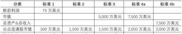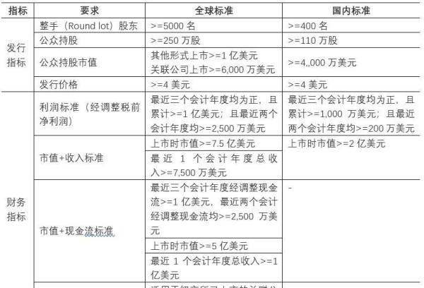 - 全球标准:主要适用于在世界其他地区已经存在上市发行股票的拟发行人,要求公司在全球范围内有足够的股东数量和更高的财务指标。非美国公司可以在两套标准中任选其一。