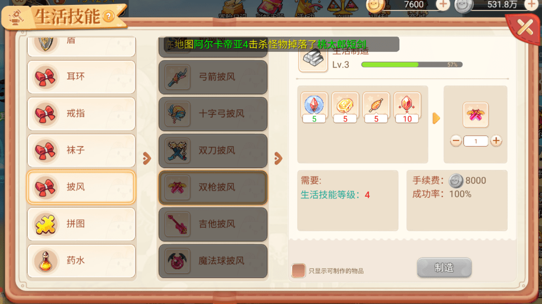 哈喽大家好,今天给大家带来一期战斗之外的游戏攻略。我相信很多玩家在看完今天这篇攻略之后会对这个游戏会有更加深入的了解。也对于大部分玩家都会有所帮助的。今天要讲的是介绍的就是生活技能。 相信不少玩家都忽略了生活技能这个选项,可能大家认为这是战斗游戏跟生活技能有什么关系,一直战斗就好了。其实则不然,生活技能是不可被忽视的。有些玩家可能发现了,在我们的装备当中有一些装备是野怪刷不出来的。比如披风啊,或者是能刷出来的装备可能就一两件,而别人有的装备都是自己没有见过的。这就是生活技能所给玩家带来的东西。 ![]() 在生活技能中我们可以看到,许多在图鉴上没有的装备,例如披风,袜子等等。而这些装备都是需要我们自己通过生活技能打造。但是前提就是要满足打造的装备所需要的生活技能等级。例如游侠转职之后火枪手所需要的双枪披风,就需要生活的等级四级。除了生活的等级之外,我们打造装备还需要相对于的原料。原料是可以挖矿或者钓鱼,采集来获得。 钓鱼是在贝罗斯的钓鱼港,大家需要注意是,我们每天钓鱼是有限制的,在外面的属性面板中有个疲劳值,当我们的额疲劳值为零的时候就不可以钓鱼了。只能等恢复,每次会消耗50点,每人每天上限是一千点,玩家也可以在商城的百货大厅功能里进行生活药剂的购买。钓鱼是可以用普通低级鱼饵去钓鱼,用容易钓到青鱼用来制造。挖矿和采集也需要附着弄。 ![]() 下面给大家讲一下前往钓鱼港的路线,毕竟小编自己刚开始也是找了好久。 ![]() 首先我们顺着地图来到贝洛斯城 ![]() 这个时候控制自己的人物朝着地图画面的左侧走到底,这时你就会看到前往钓鱼港的字样,这时你就可以传送到钓鱼点了。 ![]() 到达钓鱼港之后,随便找个钓鱼点,然后点击钓鱼,这个时候系统会提示您”请使用鱼饵“,这个时候界面的左侧会出现”普通“、”稀有“、”高级“、"传说"四个品质(钓鱼成功的概率与鱼饵品级关系较大) ![]() 没有鱼饵的时候可以来到商店里的”百货“一栏,里面有各种各样的鱼饵给大家挑选,在淘淘乐奖池以及任务完成礼包中也有鱼饵的出现。 以上,就是本期攻略的全部内容了,感谢观看,我们下期再见。 举报/反馈 |