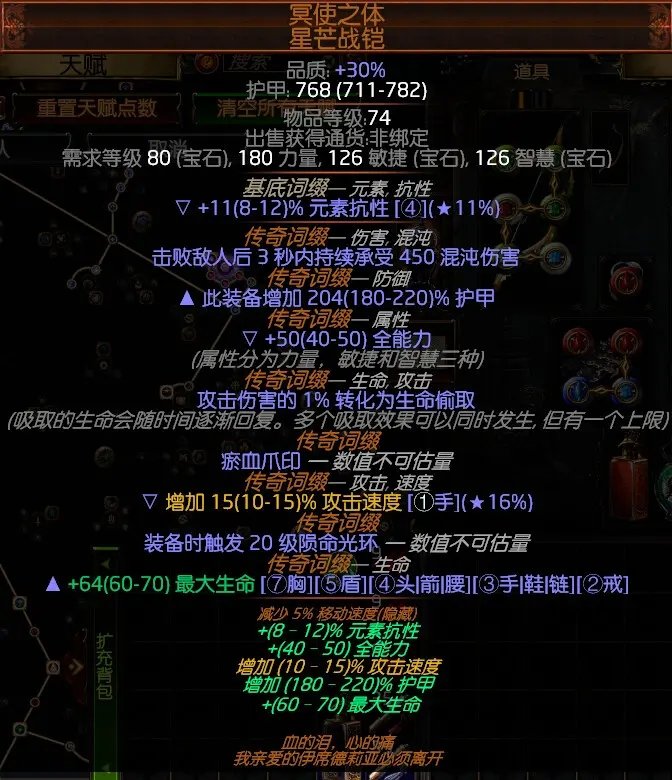 头:维里迪的面纱-领主战冠,必须+2此装备上技能石等级,其他roll越高越好。头部附魔用绝望诅咒效果提高15%。