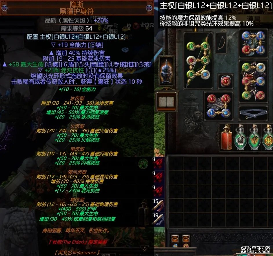 项链:隐逝-黑曜护身符,必须绝望以光环形式施放,没有魔力保留。持续伤害roll越高越好。项链涂油主权,三个白银圣油。