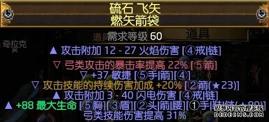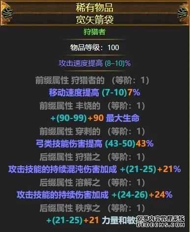 箭袋:看看自己角色缺啥补啥就行,箭袋的伤害词缀只对腐蚀箭有提升,对死神光环没提升,如果打王吃力,就换好的箭袋。下面贴个毕业箭袋和up自己在市集淘的箭袋。建议市集自己淘个。 毕业箭袋
