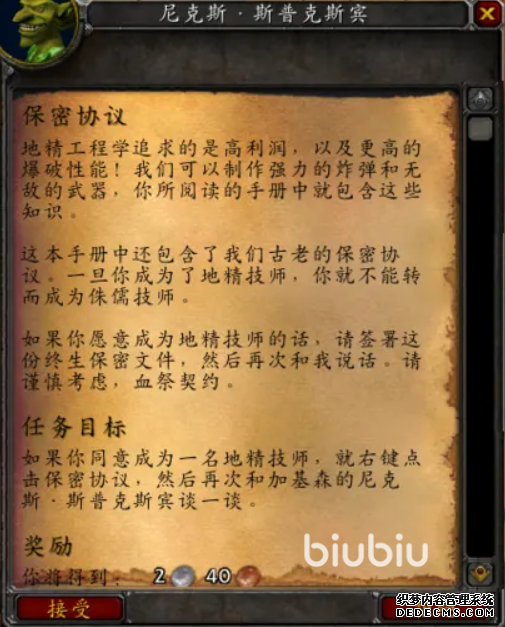 为了保证技术不外泄,学习矮人或是地精工程学之前要签订一份保密协议,玩家只能同时掌握一种工程学技能,如果想要换一个学习,只能选择退师,然后重新申请任务,向尼克斯·斯普克斯宾表明了自己想要成为地精工程师的来意之后,玩家需要血祭契约并签订一份保密协议。