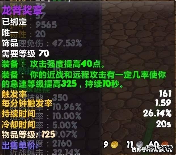 “龙脊奖章”近战玩家的极品饰品 与“红玉头冠”相比,“龙脊奖章”的获取方式简单粗暴,但更加需要运气。该装备由格鲁尔的巢穴BOSS“屠龙者格鲁尔”概率掉落,由于其提供高达40点攻击强度,再加上70年代多数职业都缺少急速属性,使得它成为了TBC版本中猎人、盗贼这类依赖高急速职业的完美毕业饰品,非常推荐玩家入手一个。