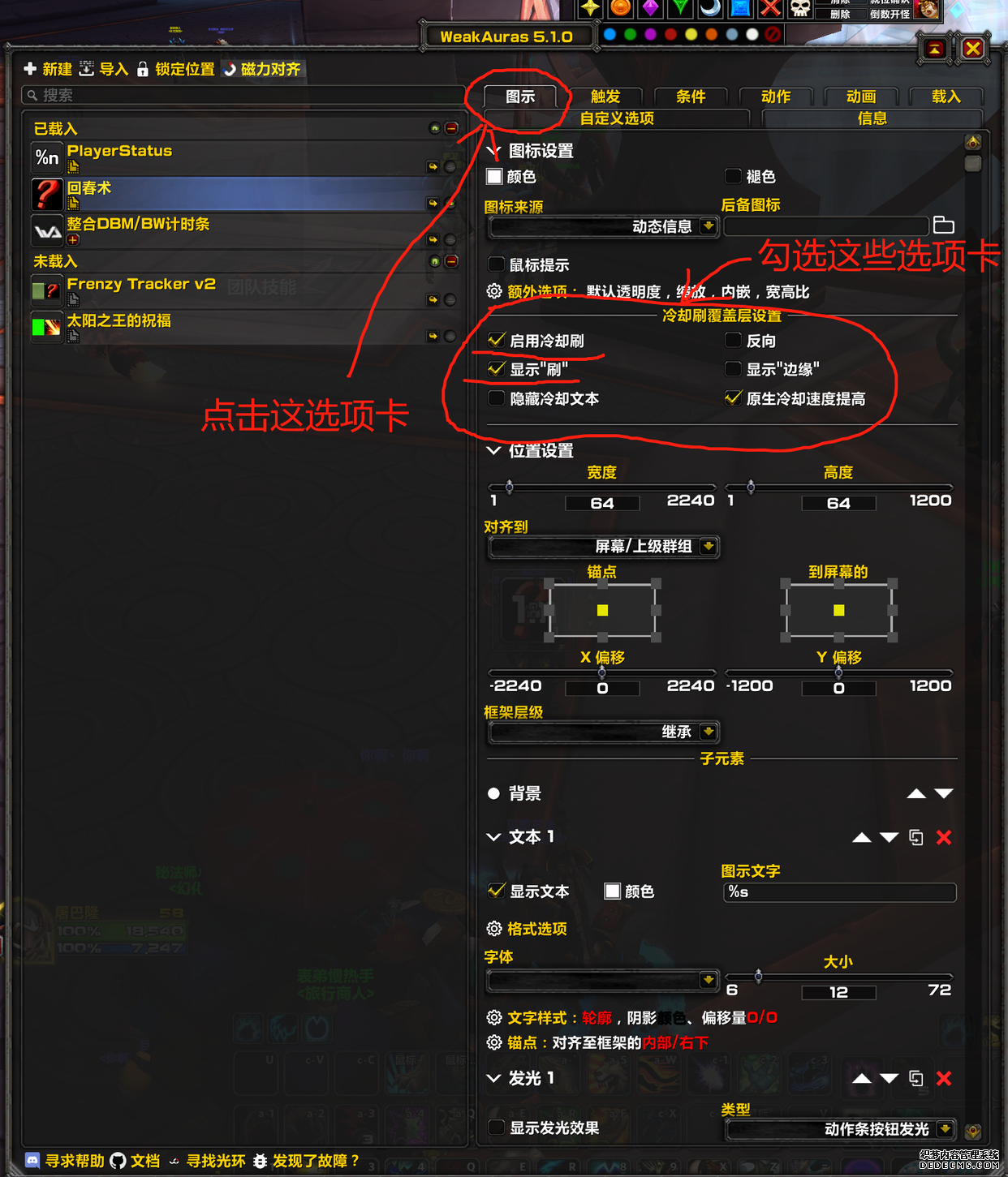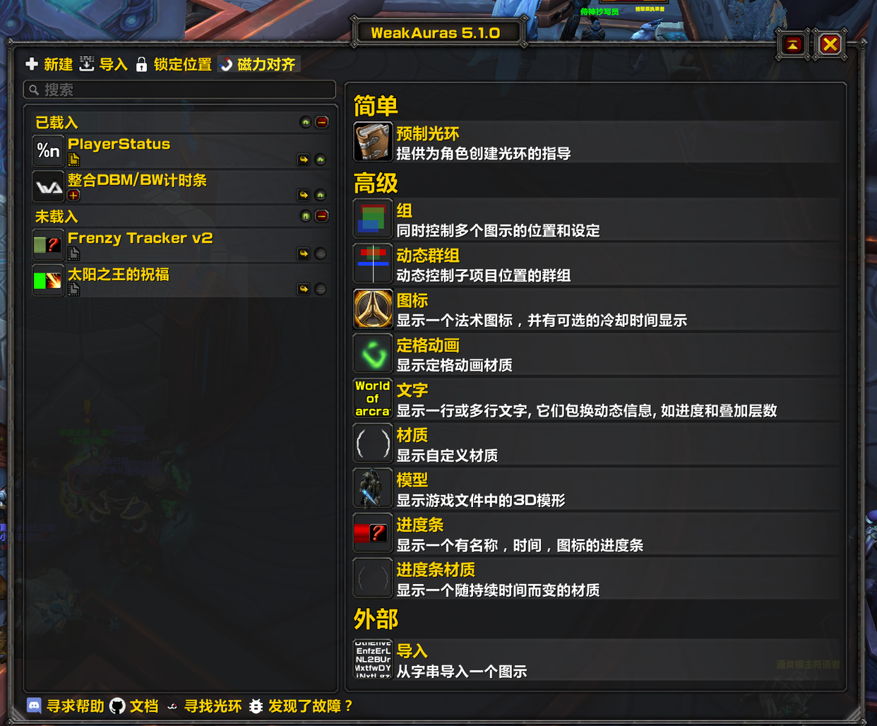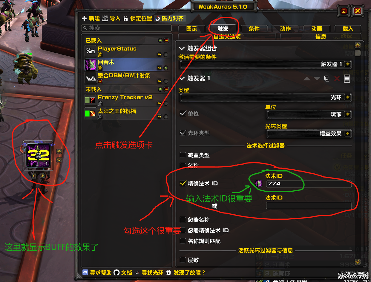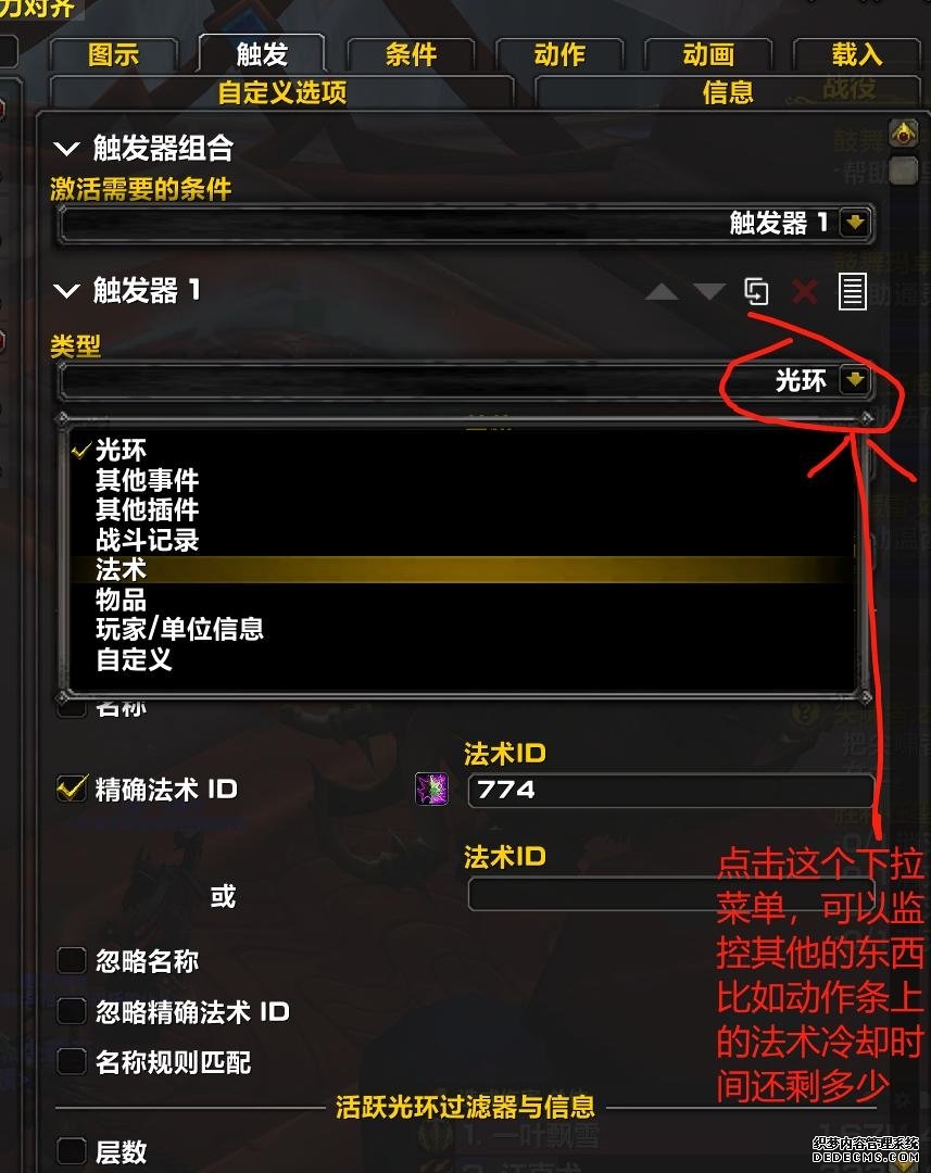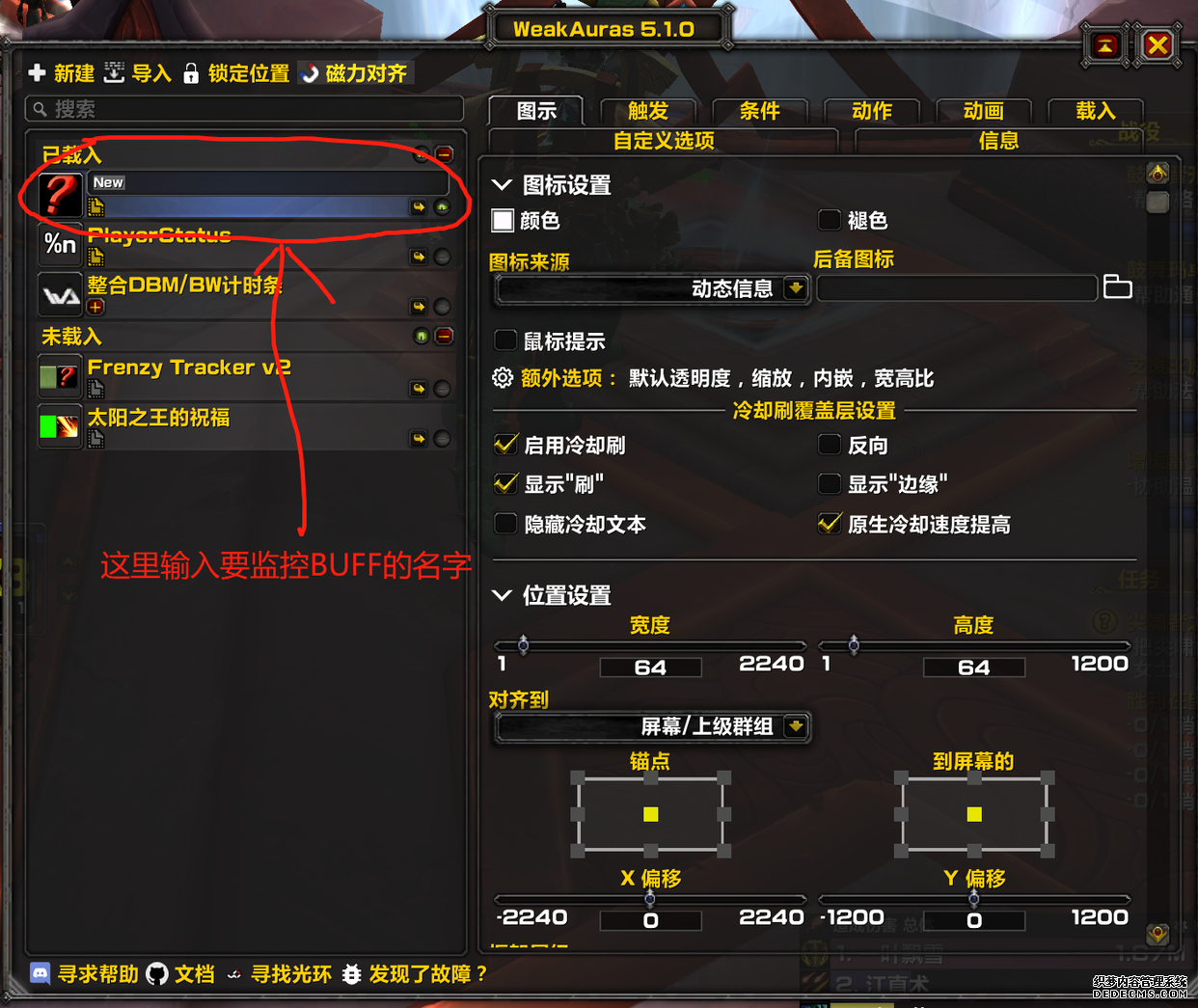 相信很多萌新玩家都遇到过被要求下载WA(WeakAuras)插件,好多萌新都不知道这是什么,当自己随口问了一句:“什么是WA”,然后你就悲催了,系统提示:你被移除了队伍!所以这个插件重不重要,可想而知!今天就把最基础的教给大家! 记得关注我,看我往期的文章,有如何下载魔兽的各种插件,包括这个重要的wa(WeakAuras)插件,这里就不详细说了,闲话不多说,切入正题! 首先要学会打开WA插件,魔兽里打开某个东西,都是用“/****”的语言命令,所以“/”开头是一个很重要的语言命令,大家一定要记住,比如:打开大笑:/大笑,打开角色跳舞:/跳舞。所以同理我们要打开"WA"插件,就在聊天框输入“/wa”打开后界面如下 魔兽世界里WA插件界面其次,如何利用WA插件做技能监控?我们先做一个BUFF技能监控,就是我们右上角BUFF监控 此处被魔兽玩家称为BUFF(增益)它们在地图的右上角,看起来很不方便,所以我可以把他调节在屏幕中间位置,虽然新版本可以通过编辑移动此区域的BUFF(增益),但是我们并不需要那么多BUFF(增益),我只要监控那些持续时间比较短的BUFF(增益)比如这个持续很短的BUFF:回春术,他只剩5秒了!而那些持续几十分钟的BUFF就不用一直监控(看着)了! ![]() 要把这个buff搬到屏幕中间自己喜欢的位置,你需要这样做: 在WA插件界面点击新建然后点击图标点击图标后出现如下界面,输入自己要监控(看)的技能的名字,然后敲回车键确定输入 ![]() 然后如下图操作,其中启用冷却刷勾选很重要! ![]() 接下来就要开始重点了,把BUFF搬到自己想要的地方,如下图 ![]() 这里需要说明一下,如果你没有安装任何插件,你是看不到法术ID的,如下图 ![]() 解决问题的方法很简单,去下载一个技能特效报警的插件就可以了,具体怎么下插件,关注我,看我往期文章,插件如图 ![]() 然后就可以看到我们的法术ID了,如图 ![]() 然后我们就可以任意拖动我们需要监控(看)的BUFF到想要的位置,还可以拉动图标小框的角落,调节图标的大小,如图 ![]() 调节图标大小的方法如下 ![]() BUFF监控就完成,所以这个插件很重要,它还可以监控动作条(屏幕最下方技能冷却时间)上法术冷却时间,方法如下 ![]() 操作原理跟监控BUFF一样的方法,就不一一讲述,大家可以自己去研究,这可以算是个作业吧,大家下去完成,完成后评论区回复“1” 今天基础教学到此为止,谢谢大家阅读,下次我们讲如何导入其他玩家现成的WA监控,大家可以提前预习下,再次感谢大家的阅读,记得点关注,免得错过更多的魔兽时间萌新教学 举报/反馈 |