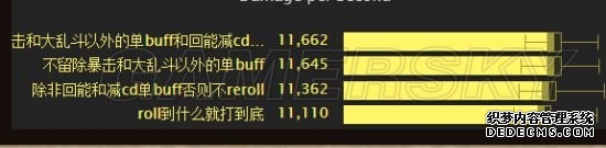 由此可见,单目标战中部落方亡灵是最优选择,联盟方熊猫人是最优选择三目标战中双方的最优选择均为熊猫人。 考虑到第一个团队副本奥迪尔的机制以及大秘境的战斗环境,适用性最好的种族为熊猫人。 附魔、宝石、食物、合剂及战斗药水 附魔: 武器附魔:根据自身属性情况自行选择附魔武器-致命远航、附魔武器-迅捷远航、附魔武器-全能远航。 戒指附魔:根据自身属性情况自行选择附魔戒指-爆击之契、附魔戒指-急速之契、附魔戒指-全能之契。 手套附魔、护腕附魔跟DPS无关,所以不予讨论。 宝石: 若全身装备有1个插槽,选用敏捷海怪之眼。 若全身装备有1个以上插槽,优先选用敏捷海怪之眼,剩下的插槽根据自身属性选用致命珀炎石、迅捷枭眼石、全能皇家石英。 食物: 若有条件则选用船长盛宴佳肴,否则根据自身属性情况自行选择蜜汁腰肉、沼泽炸鱼薯条、香薰鲷鱼。 合剂: 合剂的唯一选择为:湍流合剂。 战斗药水: DPS向战斗药水的唯一选择为:敏捷战斗药水,根据情况可选用功能性药水:德米特里的欺骗药水、海雾药水、轻足药水、隐蔽药水。 输出循环 命运骨骰BUFF收益和Reroll原则 命运骨骰BUFF收益如下:不多说了自己看吧。