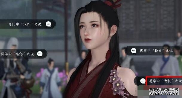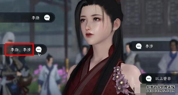 2、玩家们来到院中后,跟谢鸳进行对话,在对话时,第一个选择李渤、李涉。