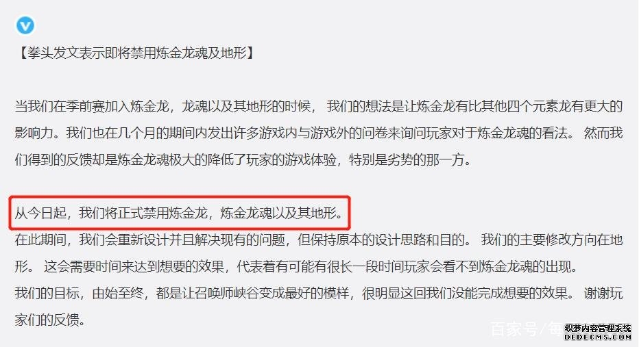 时间来到1月25日,根据赛程安排,LPL、LCK春季赛在年前的对局已经进入收官阶段,目前多家LOL俱乐部保持着不败战绩,包括领跑LPL春季赛积分榜的豪门EDG、LNG、BLG,以及愈战愈勇的LCK冠军战队T1、GEN。也许连LPL、LCK选手都未曾料到,在新春佳节到来前,LOL拳头官方会公布版本变动消息,这一次的主角便是颇具争议的炼金龙魂和相关野区地形。 ![]() 进入LOL新版本,本着提升召唤师游戏体验的初衷,拳头官方将炼金科技亚龙和海克斯科技亚龙加入召唤师峡谷,其中炼金科技亚龙的优先级更胜一筹,它不只能够在野区产生瘴气(迷雾),为英雄赋予隐身效果,还可以在队伍拿到炼金龙魂的情况下,为所有队员提供“复活”机会,虽然“复活”后的英雄生命值迅速衰减,但他们可以释放技能,继续战斗,这让拿到炼金龙魂的队伍整体战斗力大幅度提升,被翻盘的可能性微乎其微。 ![]() 回顾“大V天龙”V5与LPL豪门TES之间的对决,首局TES便是在拿到炼金龙魂的情况下,一波平推掉了敌方基地水晶。对于手握优势的战队来说,炼金龙魂的作用不亚于远古巨龙,但对于劣势方来说,炼金龙魂的存在大幅度降低了游戏体验,为了解决这一问题,LOL拳头官方决定作出调整。 ![]() 在收到大量玩家的反馈后,LOL官方决定正式删除炼金龙魂和相关地形!官推直言:回顾季前赛,我们为召唤师提供了炼金龙、龙魂、野区地形,我们想让炼金龙的影响力超过其他元素龙,从玩家那里,我们得到了反馈,炼金龙魂降低了游戏体验,对劣势方非常不友好,所以我们将正式删除炼金科技亚龙、龙魂、野区地形。 ![]() LOL拳头官推接着写道:与此同时,我们会努力解决存在的问题,主要的修改方向是地形,耗时较长,在很长一段时间里,大家不会看到炼金龙魂,一直以来,我们的目标都是让召唤师峡谷越来越好,这一次我们没能达成目标,谢谢大家的积极反馈。 ![]() 值得一提的是,LCK天才中单Chovy曾表达自己对炼金科技亚龙的不满,他无奈道:我不喜欢炼金龙和海克斯科技龙,我认为炼金科技亚龙太强了,有优势的队伍往往能够拿到炼金龙魂,即便劣势方的队伍击杀对手,他们也可能落败,有优势的队伍几乎不会被翻盘。现在看来Chovy金句成真,他对炼金龙魂的解读非常到位,说出了LOL拳头删除后者的主要原因。 ![]() 其实炼金龙魂和相关地形不只降低了劣势方玩家的游戏体验,还削减了LPL赛事的观赏性,绝地翻盘的次数降低,如今观众终于等来好消息,炼金龙魂消失后,LPL赛事悬念得到提升,话说回来,你觉得还有哪些元素龙需要被修改? 举报/反馈 |