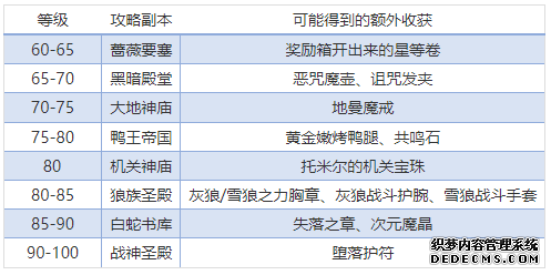 (找到这种有黄金高级栏杆的,敲掉上面的飞到上面,并敲掉神庙金块,上方就有1个天空力量块) 天空力量块存放出处大致就这些了,护石就在箱子内随机生成。 从60升到100级时,作者推荐的练级副本如下: