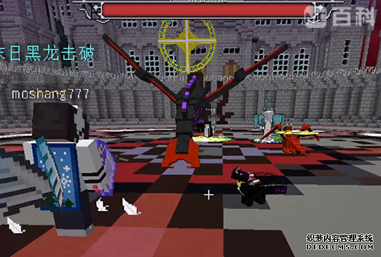 解密(阶段8)过后,将不会出现陨石,继续靠近黑龙进行输出。白魔导要预判该阶段的释放时间并召唤治愈之泉,输出位需要尽量站在治愈之泉附近,同时白魔导也要抢时间第一时间解密完,此时因为小怪还在,T和输出生存压力会大很多。 阶段9时,BOSS会先给玩家瘫痪和至残debuff,推荐集体向白魔导靠近让白魔导用神圣祈祷解除;随后在玩家脚底下生成法阵,每次召唤5个,每隔1秒召唤一个,5个法阵生成完毕2秒后将在法阵上触发闪电,造成100000点伤害。作者推荐这里带免死硬抗,或者不要乱跑,远离T,当法阵生成完成后迅速离开,并在爆炸完成后继续靠近T输出。 阶段10时,BOSS会强行回到场地中央,此时会有与挑战玩家相等数量的圣器,里面是一瓶黑龙无敌药水,在25秒后在竞技场正上方高空召唤一颗终极重力弹,注意此时BOSS是可以被攻击的,不要因为贪DPS而浪费了免死金牌: