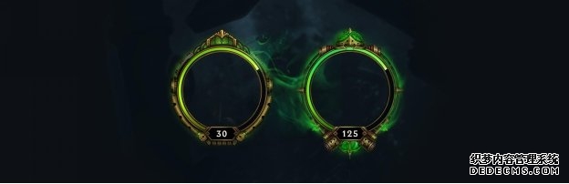 我们的解决方案仍然是利用色彩阶段系统,但要内置一个重置系统,达到特定的里程碑后将回归最低阶段的颜色,然后再度成长。这给高等级留出了我们希望的空间,同时又保留了成长系统清晰的视觉指示。为了确保在当前色彩阶段中不会滞留太久,每100级会复位一次。除了第一次的等级成长(从30级开始,50级变色)之外,每25级会成长一次。 利用主题作为成长指示 虽然现在我们有了明确的通过颜色来展示阶段的方法,但是我们仍然需要解决如何让下个阶段的绿色比上一个更好看。为了解决这个问题,我们浏览了英雄联盟的宇宙来寻找能够应用于这个色彩阶段系统,并能够帮助区分同阶段颜色的视觉元素。我们对利用了游戏的元素,符文大陆本身,甚至皮肤主题系列都进行了大量的探索。通过这些探索,我们发觉可以对成长系统的边框进行点缀,只要那几个核心物品保持原位就行: