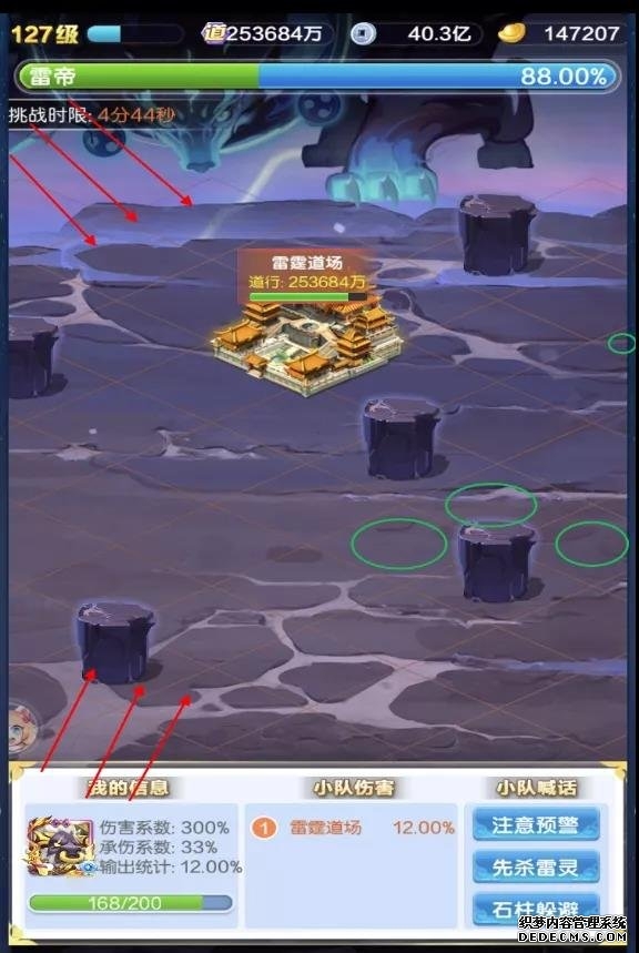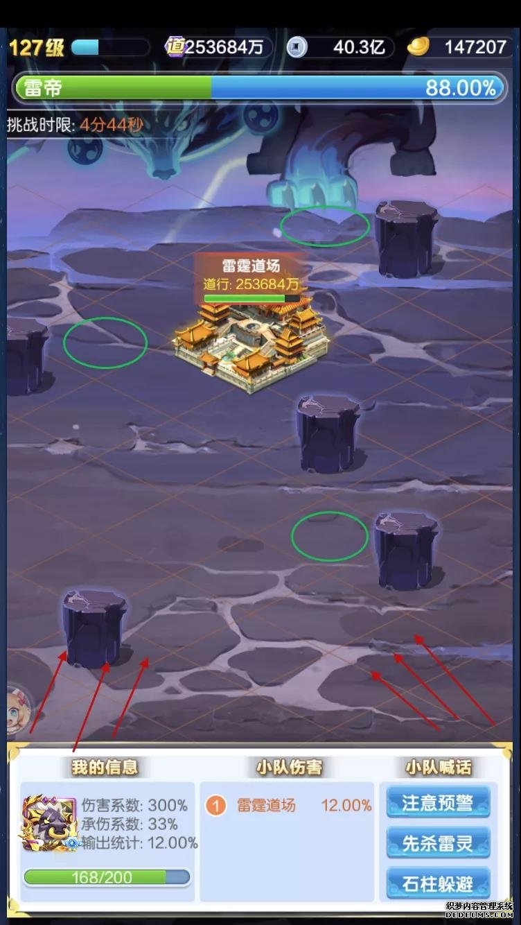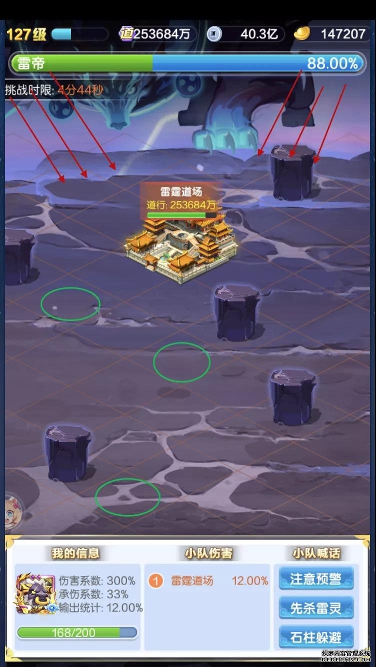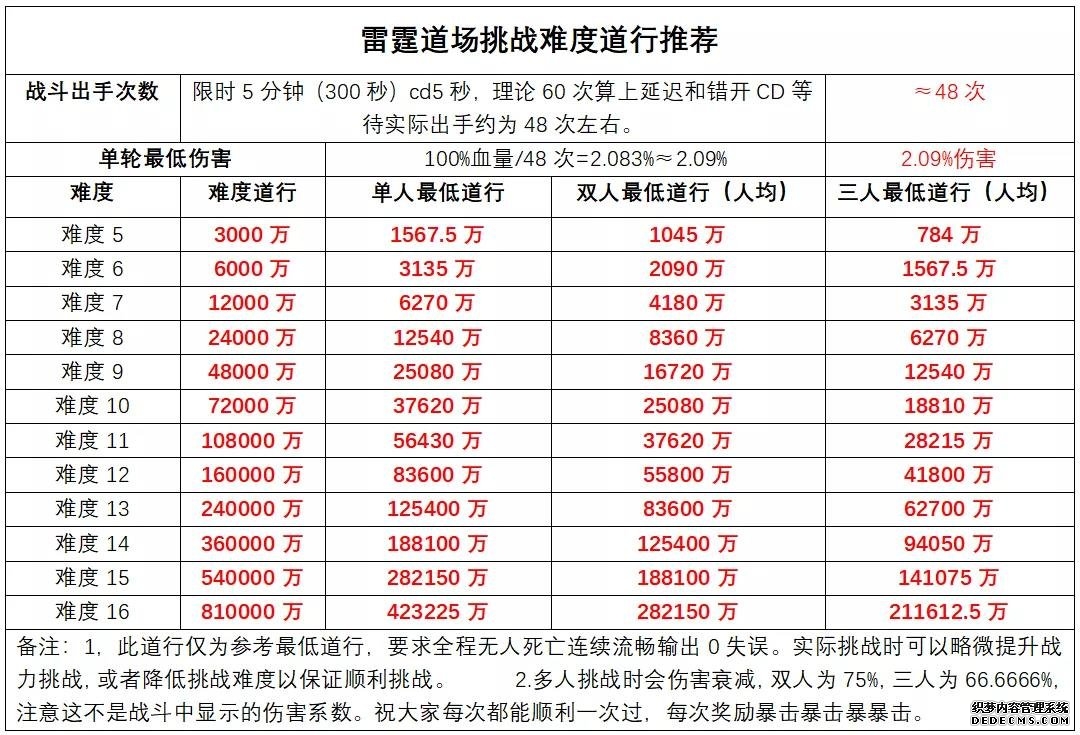 三、道行要求表 雷霆道场的最低道行要求表如下:(理论队伍每下伤害总和不得低于2.09%) ![]() 四、雷霆道场玩法介绍与技巧 ![]() Boss分为三个状态: ① Boss第一状态血量70%-100%,该阶段只需躲预警的红条即可。 ② Boss第二状态血量40%-70%,该阶段会产生雷灵,玩家可自行选择打boss或打雷灵,造成伤害等量, 但如果未击败雷灵,该雷灵会后续在其周围随机产生3个雷滩,处于雷滩上的玩家会受到少量伤害,因此建议优先击杀雷灵。 ③ Boss第三状态血量为40%以下,该段会在4个方向(自左上、自右上、自左下、自右下)随机产生雷击,雷击分为2个阶段,第一阶段在随机一个方向产生雷击,2秒后触发落雷。玩家可通过石柱规避相应方向的雷击(躲在该雷击方向上任一石柱后面任意位置即可)。触发落雷后随即进入第二阶段,第二阶段在随机两个方向产生雷击,4秒后触发落雷,玩家同样需通过石柱规避相应方向的雷击(需要同时规避2个方向,各雷击方向具体安全位置会在下文给出)。攻击节奏为找到第二阶段安全位置的站位后再攻打boss。
