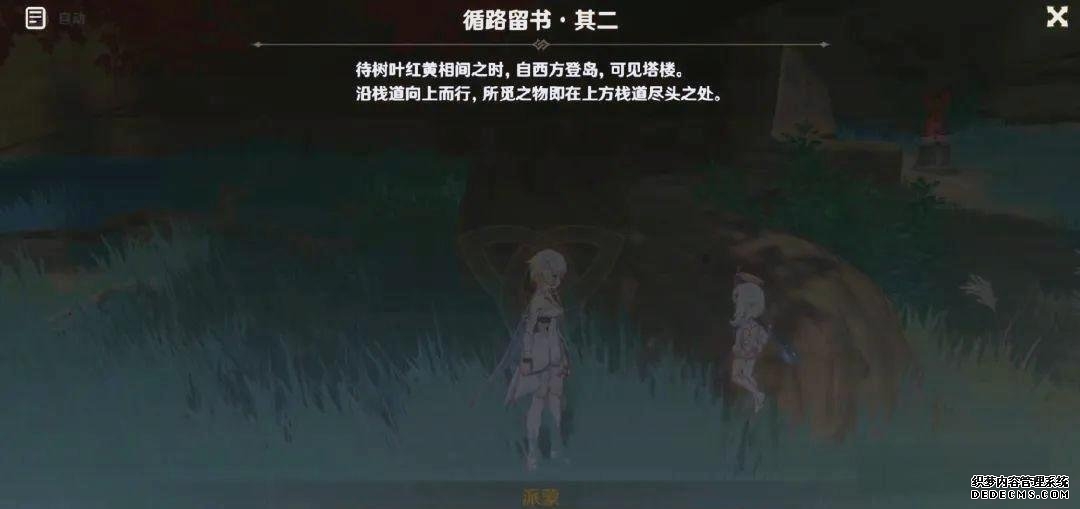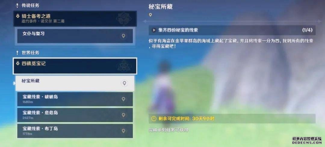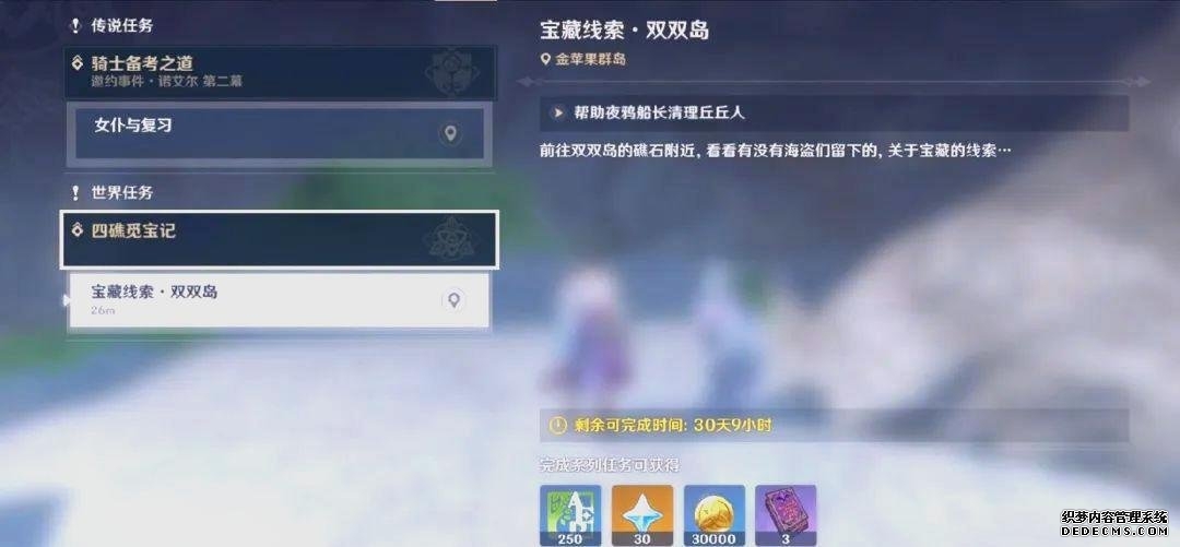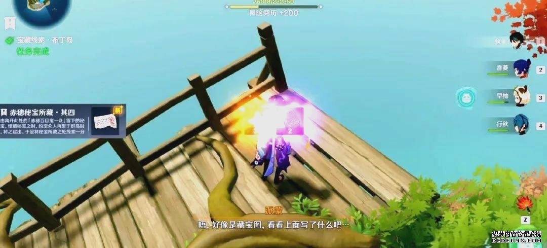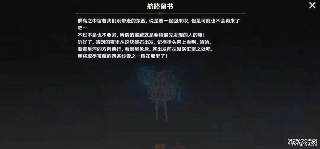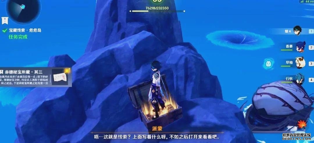 01金苹果群岛任务介绍 金苹果群岛的隐藏任务【四礁觅宝记】现已揭晓,该任务需在完成金苹果群岛【远海诗夏游记】全部主线任务后解锁。此任务包含四个子任务,分别对应海岛地图四个角落的未知小岛。完成所有任务后,将获得一个华丽宝箱,总计可获得160原石奖励! 这四个子任务的完成顺序并无特别要求,只需任意完成一个,剩余任务便会自动接取。同时,可以通过任务追踪功能,轻松定位到各小岛的准确位置。 02子任务详情 > 宝藏线索·双双岛在【宝藏线索·双双岛】中,你会发现右上角的小岛新增了一个未激活的浪船锚点。驾驶浪船前往,岛上隐藏的洞穴内有一只夜鸦,它就是你的任务向导。 ![]() ![]() 与岛上的夜鸦进行对话后,将自动触发【四礁觅宝记】系列任务中的首个分任务【宝藏线索·双双岛】。 ![]() 在洞底消灭怪物后,借助风车启动的风场,飞回至洞顶,随后与夜鸦进行交谈。 ![]() ![]() 在洞顶与夜鸦交谈完毕后,你需要攀爬至小岛的更高处,再次与夜鸦进行对话。之后,你将开启浪船,并依据夜鸦提供的文字提示路线前行。若在途中不慎跟丢,只需留意周围礁石上的夜鸦标记,那里便是你的下一个目的地。 ![]() ![]() 抵达最终的大岛后,你将发现一个隐藏的宝箱。开启它,你将获得关于宝藏的线索二。完成此任务后,你将获得丰厚的任务奖励,并自动解锁剩余的三个分支任务。 ![]() ![]() ![]() > 宝藏线索·布丁岛『宝藏线索·布丁岛』 跟随任务指引,你抵达了小岛。在洞穴的深处,你发现了一些雷史莱姆和一只隐藏的宝箱。在击败这些雷史莱姆后,你打开了宝箱,从中获得了一条关于宝藏的重要线索。 ![]() ![]() 抵达布丁岛后,你发现岛上的地形错综复杂,需要通过巧妙地调整假山的位置,使得左右两侧都呈现出浮光山石的景象,这样才能继续探索宝藏的线索。 ![]() 抵达布丁岛的山顶后,你发现了一处传送点。通过传送,你降落到了山脚,随即向标记点方向飞去。在一片红叶树下,你发现了一个闪烁的光点。走近光点,你成功获取了另一条关于宝藏的线索。 ![]() ![]() ![]() 返回布丁岛的传送点,调整假山两边的机关,使磐固山石显现。再次通过传送,抵达山顶传送点。朝着岩元素方杯的方向飞行,你会看到一座断桥。在断桥的光点位置,你找到了宝藏的第四条线索。至此,该分任务圆满完成,奖励随即到手。 ![]() ![]() ![]() > 宝藏线索·危危岛『宝藏线索·危危岛』 追踪任务指引,抵达小岛后,在岛内洞穴的深处,你需要击碎一块巨大的岩石。岩石背后,隐藏着一个珍贵的宝箱。打开这个宝箱,你将获得一条关于宝藏的重要线索。 ![]() ![]() 在完成洞穴探险后,驾驶小船出海,抬头仰望天空,寻找那个独特的星盘图案。一旦找到,就朝着图案所指的方向前行,直至经过星盘的位置。之后,继续沿直线航行,不久后你会发现前方有一座小岛礁。抵达岛礁后,在隐藏的宝箱中,你将找到第三条关于宝藏的线索。成功获取这条线索后,本次分任务即告完成,奖励也将随之而来。 ![]() ![]() ![]() > 宝藏线索·破破岛『宝藏线索·破破岛』 追踪任务指引,你抵达了小岛。眼前,一个宝箱被一个喇叭机关所锁住。你需要细心调整喇叭的朝向,以解开机关的秘密。一旦机关解锁,宝箱便会打开,露出里面的宝藏线索。将这些线索一一合成,你将最终拼凑出完整的宝藏图。完成这一分任务后,丰厚的奖励也将随之而来。 ![]() ![]() 03最终宝藏 抵达海岛地图中央小岛,乘坐浪船锚点的船只,你将发现前方水面涌现出众多漩涡。这些漩涡之中,似乎隐藏着什么秘密。深入探索,你或许能揭开最终宝藏的神秘面纱。 ![]() ![]() 漩涡中央,一个神秘的水泡若隐若现,触碰后,一个奇妙的水母云阶机关浮现眼前。 ![]() 踏上水母云阶,你将被引领至漩涡之上的神秘空间,那里隐藏着一个华丽的宝箱,里面装着最终宝藏。 ![]() 踏上水母云阶,你将被引领至漩涡之上的神秘空间,探寻那个华丽的宝箱,发现其中蕴藏的最终宝藏。 举报/反馈 |