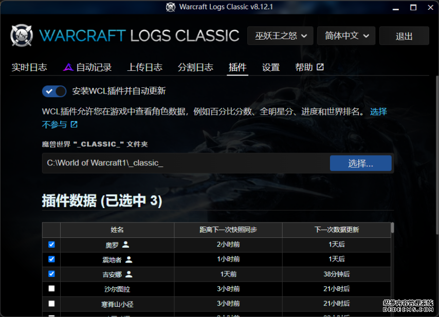 如图开启安装WCL插件并自动更新 选择魔兽世界怀旧服 _classic_ 客户端路径 客户端会自动更新插件 有绑定角色的用户会默认勾选相应服务器 也可以手动选择需要的服务器更新数据 创建或加入公会。如果您所在的公会有负责上传WCL日志的玩家,您可以联系他获取Guild Code(公会识别码)和Guild Link(公会链接)进入公会(如果您自己创建公会请务必保存好这两组数据),散人玩家可以跳过这一步,上传个人数据同样有排名。