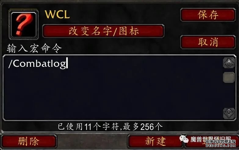 然后我们新建一个记录战斗日志的宏命令。非常简单只有一行:/Combatlog 点击一次开始记录,再点一次停止记录。