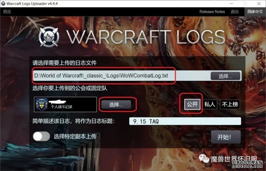 打完副本记录好数据后打开上传程序,选择怀旧服-上传日志,日志文件路径如图所示,可以选择以个人或公会日志,如果要参与排行一定要选择公开。上传完成后一定别忘了删除本地战斗日志哦。