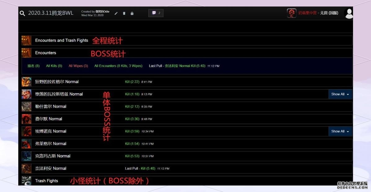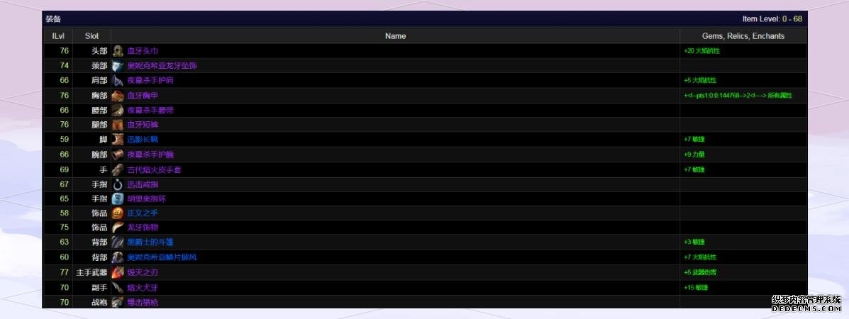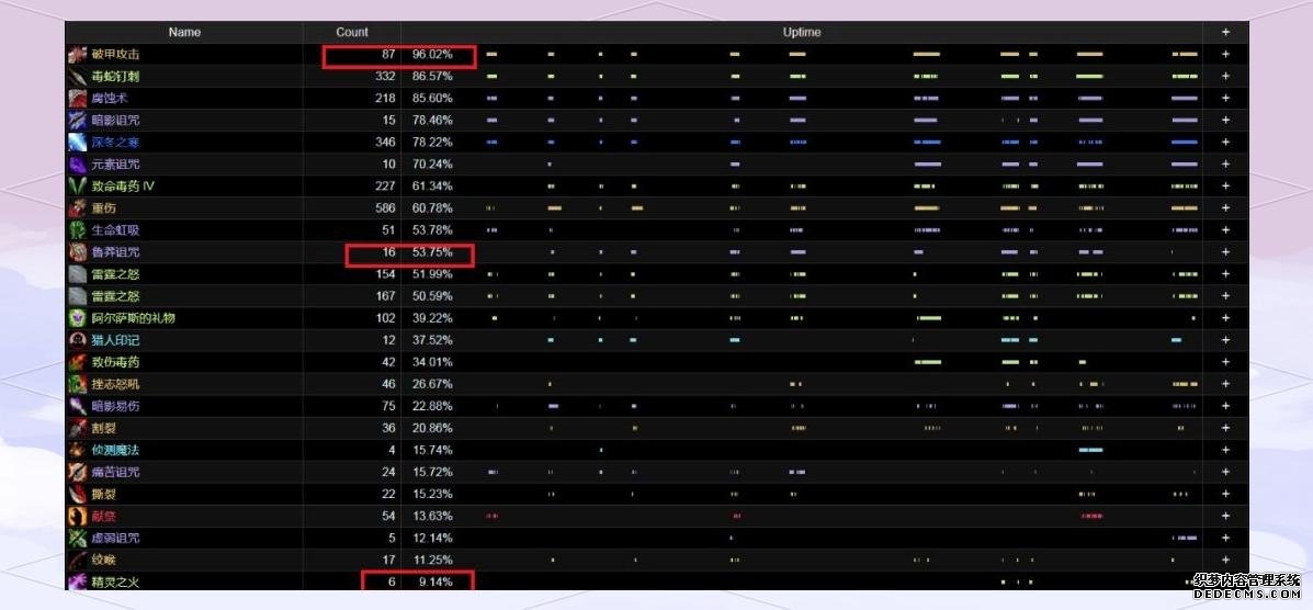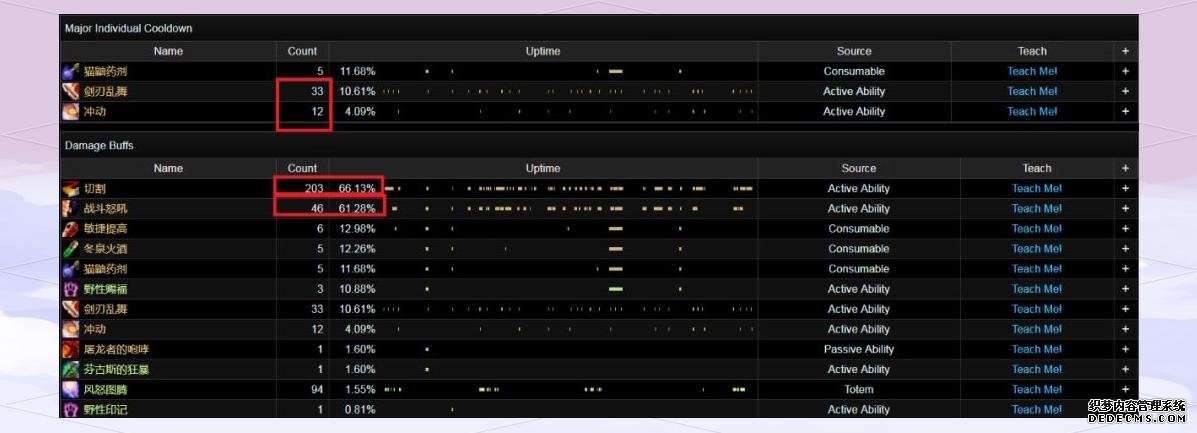 011. WCL概述和使用分析 我们团队在魔兽世界中的WCL网址为: ![]() 进入WCL的战斗日志列表,我们选取了3月11日发生在BWL的战斗日志。此时的界面如下: ![]() 我们可以清晰地看到,从上到下的大纲中包含了战斗的全过程、各阶段BOSS、单体BOSS以及小怪统计。同时,还有灭团次数的记录,以红色“ALL Wipes”显示,共计3次。若某个单体BOSS曾导致灭团,其详情可在右侧单独查看,或选取其中一场灭团战斗进行深入分析。 在浏览战斗日志时,我们通常首先关注全程统计,以了解整体战斗情况。若发现某些BOSS的战斗表现不如意,便可进一步单独查看这些BOSS的详细数据。 022. 数据分析详解 2.1 > 伤害统计概览在战斗日志中,伤害统计无疑是首要关注的重点。通过它,我们可以快速了解到各阶段BOSS以及单体BOSS所造成的伤害情况,进而分析战斗中的薄弱环节。 ![]() 从左至右,五个红框内分别展示了:总评分、输出占比、输出总量、同装等评分以及活跃度。其中,活跃度是一个关键指标,特别是在包含小怪战斗的全程中,BOSS的活跃度数据往往更高。通常,70%~80%的活跃度被视为可接受范围,但追求更高的活跃度无疑是更理想的选择。若全程活跃度异常低,除非是特定角色(如工具人),否则可能被判定为消极参与。值得注意的是,在相同职业之间,活跃度的高低与输出能力的高低往往呈现正相关关系。 2.2 > 伤害构成分析选取特定玩家,如风从大佬,通过点击左边红框中的“所有玩家”选项,再选择目标玩家,即可查看该玩家在所选战斗范围内的详细伤害构成。图中所示的风从的伤害构成数据,涵盖了整体战斗过程,包括小怪战斗的数据。这些数据提供了他在战斗中的技能使用占比、释放次数、命中次数、MISS几率以及暴击几率等关键信息。 ![]() 2.3 > 增益效果分析在伤害构成分析的基础上,我们还可以进一步探讨玩家的增益效果。通过观察玩家在战斗中获得的各类增益,如攻击力提升、防御力增强等,可以更全面地了解玩家在战斗中的实际表现。这些增益效果不仅会影响玩家的伤害输出,还会对其生存能力产生重要影响。通过详细分析这些增益效果的变化趋势和持续时间,我们可以更深入地揭示玩家在战斗中的策略和技巧。 ![]() 033. 敌对目标的DEBUFF控制 我们团队在DEBUFF管理方面缺乏明确要求,这无疑给追求高DPS的成员们带来了不小的挑战。在最近的BWL活动中,我们可以观察到,鲁莽效果的覆盖时间远远不够,而精灵火的使用更是寥寥无几,这对物理职业来说无疑是巨大的损失。 ![]() 实际上,合理运用5破+鲁莽+精灵火这三种BUFF,其效果往往超越了一个龙头+风歌的组合。要想在游戏中取得优异成绩,甚至跻身排行榜,世界BUFF的掌握、熟练的手法,以及上述三种BUFF的合理运用,再加上一点运气,都是不可或缺的因素。 044. 职业分析和对比方法 4.1 > 基于排行榜的对比针对同团队的职业分析,若缺乏直接对比对象,可参考排行榜中正常配置的队伍或高评分选手进行横向对比。以盗贼组为例,简要探讨如何在团队内进行对比学习与提升。 ![]() 选择盗贼职业图标进行深入探讨,在团队中若发现同一职业的伤害输出与顶尖玩家存在差距,推荐采用横向对比的方法来进行分析与提升。由于你们身处同一团队,各方面条件相似,因此这种对比方式效果显著。 ![]() 从装备对比中,我们可以明显看出,风从在除了裤子以外的部位都已附魔齐全,且附魔方向选择正确。而小渣男在护腕、手和武器等部位未进行附魔,这可能会影响到他的输出能力。 ![]() 4.2 > 设备和技能对比分析接下来,我们还将探讨BUFF/施法管理的重要性。在装备对比的基础上,我们可以进一步深入,通过选择自己和对比玩家的ID,进行更详细的对比分析。这样,我们可以更清晰地看到双方在装备、附魔以及天赋等方面的差异,从而找出提升自己游戏角色的关键所在。 接下来,我们聚焦于“伤害”这一栏位,通过观察下面的输出对比图,我们将深入剖析关键信息。通过对比不同盗贼选手的伤害输出,我们可以观察到同一职业在团队中的伤害贡献差异。 此外,我们还需要关注时间轴的把握。在战斗中,合理的时间轴把控对于角色的战斗表现同样至关重要。通过精确的时间轴把控,我们可以更好地发挥角色的技能优势,从而在战斗中占据优势地位。熟练掌握并运用这些工具,将有助于我们迅速提升战斗力。 举报/反馈 |