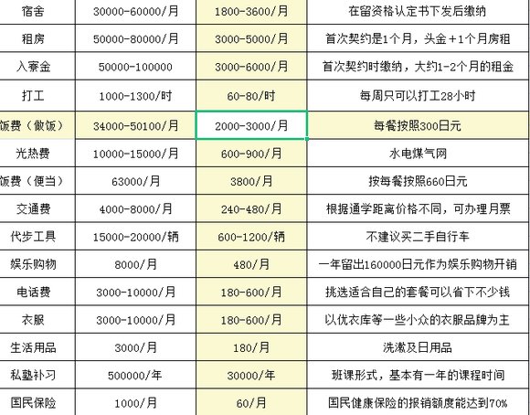 赴日留学费用篇 最近很多学生问我关于去日本留学的费用 总结了大概常见的几种留学费用 有不懂或者其他问题欢迎留言 。 一 语言学校(需读一年到2年 也有半年的) 首先学费 学费大部分的费用基本为75w 日元 人民币大概4-5万元 一年语言学校的总费用大概为10到15万人民币 这个就看每个同学的消费观念 家庭水平什么的 有就多花 没有少花点呗 二 研究生预科(需读一年 很多同学半年就能考上修士) 三 修士 (需读俩年 医学除外) 1 国公立大学学费 各个学校学费一致 535800/年 人民币3万2一年 2 入学金282000 人民币1万7(每个新生入学必须缴纳的, 仅需缴纳一次。) 3私立大学的学费(不同学校和专业之间有所差别) 常规840000/年日元 人民币5万多 艺术类院校 800000-1750000/年日元 人民币5万到11万不等。 注 : 租房费用 单租,留学生带独立卫浴厨房的单间,房间9㎡,总面积在16-18㎡左右。东京都23区离地铁近的一般在60000日元以上,人民币3600元 23区外30000-50000日元 合租,东京都23区,50000日元/月,人民币3000元/月。 2 打工挣钱, 以东京为23区为例,大概1000日元/小时。人民币60元左右。一周最多打工28小时(入管局规定时间),一个月大概有11万日元收入人民币6700多 其他地区大概在800-900日元/小时。 3 私塾 1对1形式:大概10000日元-12000日元/小时,人民币大概600多元 一般50课时起报名;班课形式:大概500000日元左右,大概3万多人民币 具体的根据私塾的实际课程来看。 最后附一张详细图片