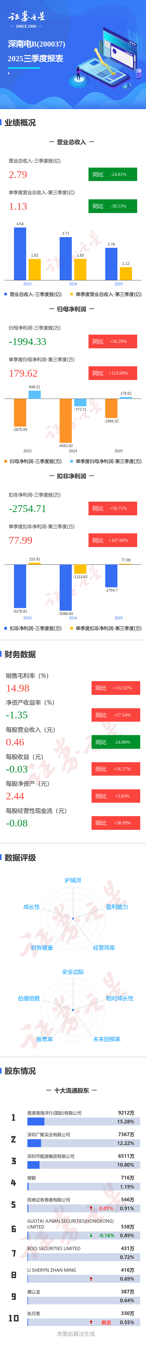 证券之星消息,深南电B2025年三季报显示,公司主营收入2.79亿元,同比下降24.82%;归母净利润-1994.33万元,同比上升56.29%;扣非净利润-2754.71万元,同比上升50.72%;其中2025年第三季度,公司单季度主营收入1.13亿元,同比下降38.54%;单季度归母净利润179.62万元,同比上升123.1%;单季度扣非净利润77.99万元,同比上升107.0%;负债率25.31%,投资收益1675.81万元,财务费用330.51万元,毛利率14.98%。 财报数据概要请见下图: ![]() 为证券之星据公开信息整理,由AI算法生成(网信算备310104345710301240019号),不构成投资建议。 (责任编辑:admin) |