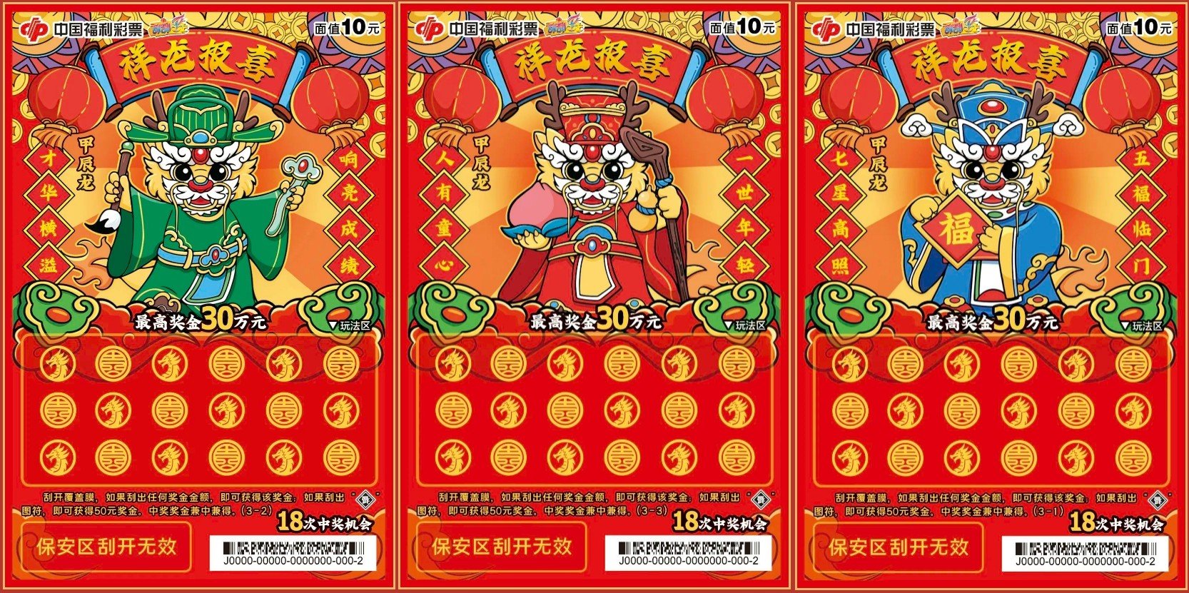 “甲辰龙”系列生肖彩票包含“祥龙报喜”“瑞龙纳福”“福龙贺岁”“福耀龙腾”四款,面值分别为10元、20元、30元、50元。