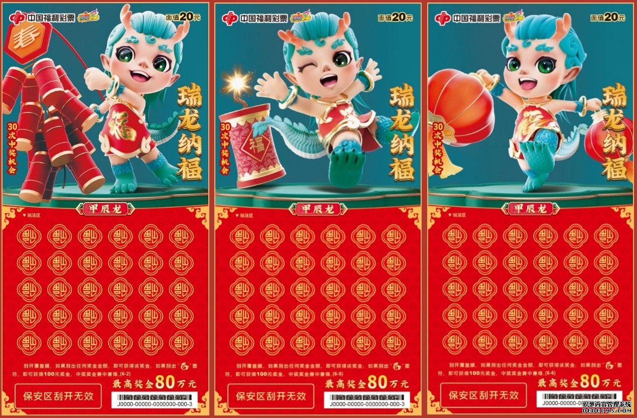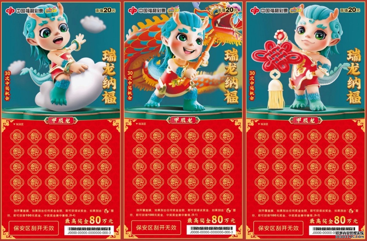 “瑞龙纳福”面值20元,共设10个奖级、30次中奖机会,最高奖金80万元。