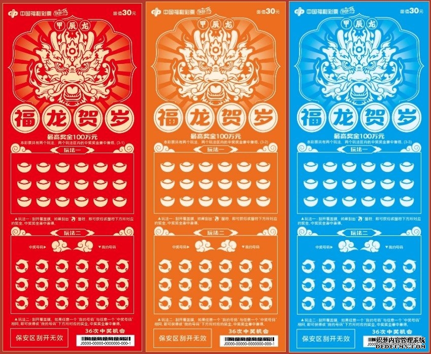 “福龙贺岁”面值30元,共设9个奖级、36次中奖机会,最高奖金100万元。