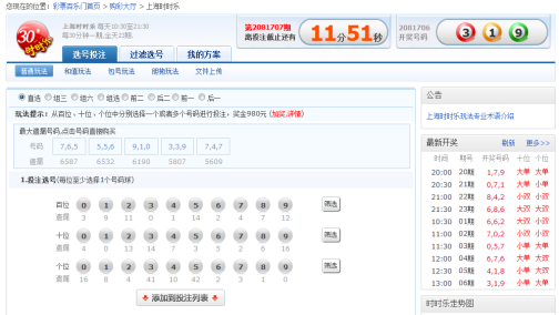 播报 编辑 上海时时乐 [1]又称为天天彩选三。“天天彩选3”(时时乐)是经财政部财办综2004207号文批准在上海地区销售的数字型电脑福利彩票。属于高频彩票(快开彩),半小时一期,全天23期。 播报 编辑 第一章 总则 第一条 本根据《彩票发行与销售管理暂行规定》和《中国福利彩票发行与销售管理暂行规定》,制定本规则。 第二条 “天天彩选3”(时时乐)电脑福利彩票(以下简称“时时乐”)由中国福利彩票发行管理中心统一发行。经中福彩中心授权,上海市福利彩票发行中心在所辖区域内承销“时时乐”。 第三条 “时时乐”采用计算机网络系统发行销售,定期开奖。 第四条 “时时乐”实行自愿购买,凡购买者均被视为同意遵守本规则。 第五条 不得向未成年人销售彩票或兑付奖金。 第二章 投注 第六条 第六条“时时乐”是指从000-999的数字中选择一个3位数、2位数或1位数为投注号码进行投注的数字型彩票,每注金额2元人民币。 第七条 “时时乐”在上海市电脑福利彩票专卖店销售,每天销售23期,每天上午10:30至晚上22:00每半小时开奖一次。 第八条 “时时乐”的投注方式分为单选投注、组选投注。 单选投注是将投注号码以唯一的排列方式进行单注投注。单选3投注是指将3位数以唯一的排列方式进行单注投注,简称“单选3”;单选2投注是指按位数只对百位数和十位数,或者按位数只对十位数和个位数进行单注投注,分别简称“前2”和“后2”。单选1投注是指只对百位数,或者只对个位数进行单注投注,分别简称“前1和“后1”。 组选投注是将投注号码的所有排列方式作为一注投注号码进行的单注投注。如果一注组选号码的3个数字各不相同,则有6种不同的排列方式,因而就有6个中奖机会,这种组选投注方式简称“组选6”;如果一注组选号码的3个数字有两个数字相同,则有3种不同的排列方式,因而就有3个中奖机会,这种组选投注方式简称“组选3”。 第九条 “时时乐”每期每个号码的投注注数,根据市场销售情况限量发行,由上海市福利彩票发行中心根据实际情况确定具体的限额。 第十条 “时时乐”每个投注号码的投注注数每次最多可选择50注。 第十一条 “时时乐”在售出后5分钟内,因故可在售出该票的终端机上注销,但不得超过本期销售截止时间。 第三章 设奖 第十二条 “时时乐”的设奖奖金占销售总额的50%,其中:当期奖金49%;调节基金1%。 第十三条 “时时乐”当期奖金设奖如下: 单选奖:单选3:单注奖金额固定为980元; 前2:单注奖金额固定为98元; 后2:单注奖金额固定为98元; 前1:单注奖金额固定为10元; 后1:单注奖金额固定为10元, 组选奖:组选3:单注奖金额固定为320元 组选6:单注奖金额固定为160元 第十四条 “时时乐”设置奖池。奖池由当期奖金与实际中出奖金的差额组成。当期中出奖金未达当期奖金时,余额进入奖池;当期中出奖金超出当期奖金时,差额由奖池补充。当奖池总额不足时,由调节基金补足,调节基金不足时,用发行经费垫支。 第十五条 调节基金包括按销售总额1%提取部分、弃奖收入、逾期未退票的票款。调节基金用于支付各种不可预见的奖金支出风险,以及设立特别奖。 第四章 开奖 第十六条 “时时乐”摇奖过程在公证人员监督下进行,摇奖结果通过通讯网络向各投注站传送。 第十七条 “时时乐”使用中国福利彩票发行管理中心指定的专用摇奖器。摇奖器按个位、十位、百位顺序摇出一个三位数,即为当期中奖号码。 第十八条 摇奖前5分钟之内截止当期投注,将所有投注数据录入光盘或磁带。摇奖后,以光盘或磁带记录的数据为准进行开奖处理。 第五章 中奖 第十九条 单选投注号码与中奖号码按位数完全相符,即中奖。 第二十条 组选投注号码与中奖号码相同,顺序不限,即中奖。 第六章 兑奖 第二十一条 中奖者凭中奖彩票兑奖。中奖彩票因玷污、损坏等原因不能正确识别的,不能兑奖。 第二十二条 每期开奖次日起3天内(含3天)为兑奖期,逾期未兑,中奖作废。 第二十三条 “时时乐”所有中奖彩票均在专卖店兑取。 第二十四条 兑奖机构有权查验中奖者的中奖彩票及有效身份证明,兑奖者应予配合。 第二十五条 凡伪造、涂改中奖彩票冒领奖金者,交司法机关追究法律责任。 第七章 附则 第二十六条 本规则由上海市福利彩票发行中心解释。 第二十七条 本规则自发布之日起执行。 播报 编辑 ![]() 上海时时乐(2张) ● 每天销售23期,从10:30-22:00每半小时开奖一次。每期开出一个三位数中奖号码。 ● 当期设奖奖金占销售总额的50%,其中返奖金奖金49%;调节基金1%。 ● 设奖和中奖如下: 投注方式 投注号码(举例) 中奖号码(举例) 中奖奖金(单注) 选择三位数 单选3 123 123 980元 组选3 455 554 545 455 320元 组选6 123 213 312 132 231 321 123 160元 选择两位数 前2 67 - 678 98元 后2 - 78 选择一位数 前1 9 - - 980 10元 后1 - - 0 注:单选3、前2、后2、前1和后1均为直选。 ● 返奖奖金与实际中出奖金的差额组成奖池。当返奖奖金不足时,由奖池补充。 ● 在福利彩票专卖店或部分投注站销售,每注2元。 ● 可自选或机选号码投注。也可“包号”投注。 ● 每个投注号码的投注注数每次同时最多可投50注。三位数的投注注数将根据市场销售情况限量发行。 ● 彩票在售出5分钟内可在现场注销,但不得超过当期销售截止时间。 ● 彩票票面中,符号“-”表示无数