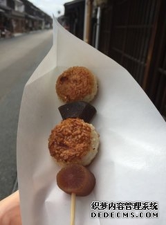 下山的附近有一些街坊,偶有几家小吃和小工艺品店开着,我见一家门口描述得像是犬山城特色美食的样子就买了一个串,然而并不好吃,他在米饭团子外面抹了酱油,煎炸过,再和两个腌萝卜串在一起,很咸。