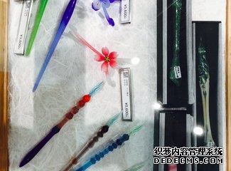 下面的笔似乎是玻璃做的,剔透精美,墨水有各式颜色。 但估计容易破,试用的几十支笔里好多笔头都坏掉了。