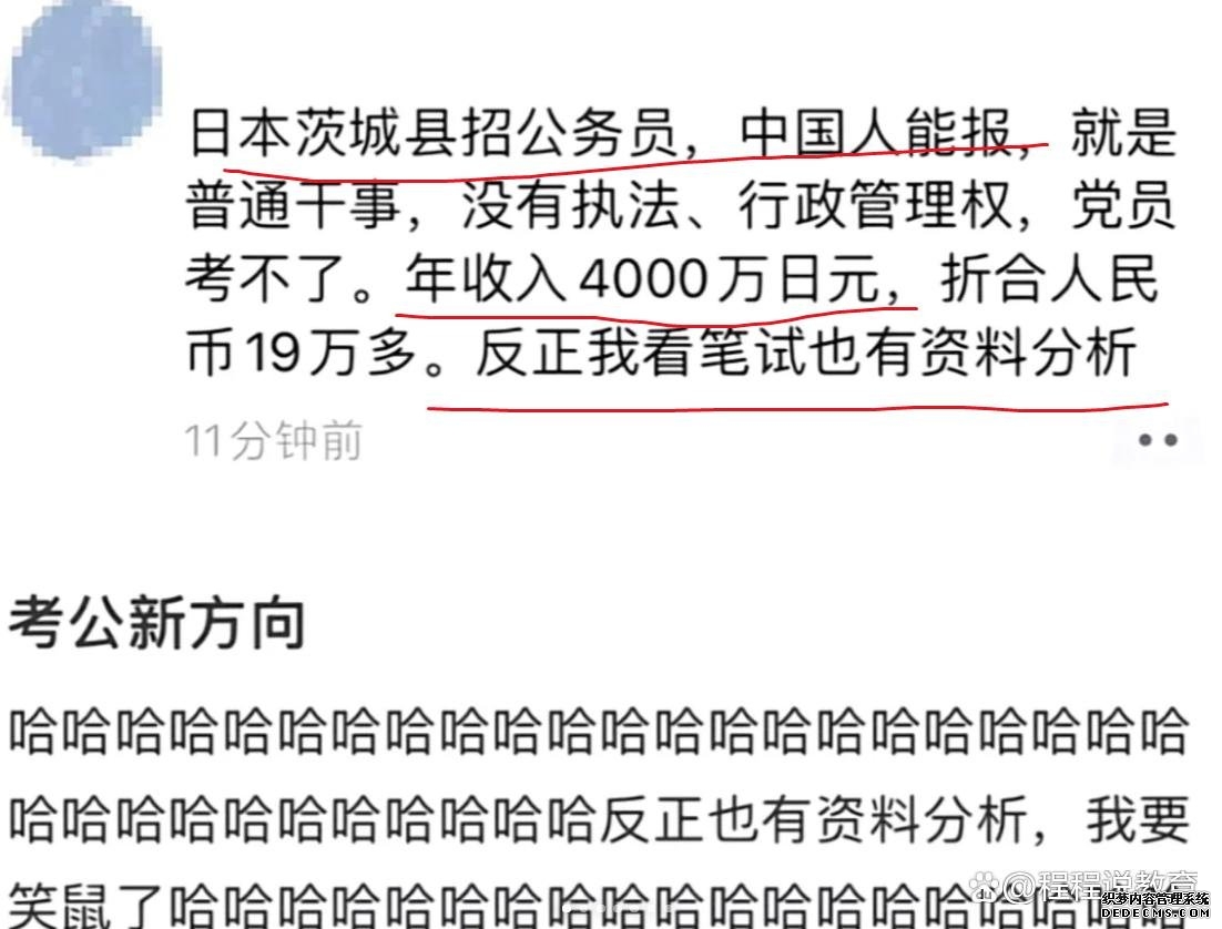 都说考公务员好,但是国内的考公赛道实在是太卷了,最近有很多学生竟然另辟蹊径,想到了去国外考公,还真有成功的案例,有一个在意大利读书的男生,留学期间发现当地的公务员招考并且并不限留学生报考,在他的一番努力准备之下还真就考上了意大利的公务员,据说那里的待遇相当之高。 一看籍贯,原来这位男同学又是山东的。如果有一天国内的公务员特别不好考了,不知道屏幕面前的你是否也想去国外试试呢?但是选择哪个国家又是一个关键点。 ![]() 越来越多的大学生似乎认清了一个事实,考公重要的不是过程,不断地努力,而是结果在于哪怕最后考上的岗位可能与自己想象中的差之甚远,甚至是考到了海外去。但是只要稳定并且说起来的时候,让父母觉得在别人面前有面儿,那似乎也是不错的。 毕竟都是异曲同工嘛。有很多学生一年、两年、三年的时间都用来考公,考到最后自己似乎有些饥不择食了,哪怕是海外的消息他们也要看一看。最近有人发了一个考公热门的消息,据说是日本某个城县开始招公务员了。 ![]() 这个本来跟咱们没啥关系,但问题是消息中加了一句你是中国考生,你也能报。报完了之后就是普通干事,没有执法和行政管理权,而且对于在大学入党的,自然也考不了了。 可是在年收入方面让人眼前一亮,原来年收入大概是4000万日元,折合人民币是19万多,年薪19万多,在国内的公务员可能也没有这个待遇吧。但是仅听这个消息显然还是不够的,据说还有好事儿的网友上网上查了一下。 ![]() 发现如果参加笔试包含资料分析,那似乎也正好对上了如今考公学子的舒适圈儿,反正考哪儿都一样,为什么不试试呢?有的同学立马就想明白了高中的时候为啥可以让选日语了?看来这真的是多学一门语言,以后说不定就有能用的地方。 山东IP的考生再一次坐不住了,毕竟这个考公大省大家都想谋得一份铁饭碗的工作,只是有一位考生考虑的也很实际,我作为山东的去国外工作倒也没什么,但是就怕难以向祖宗交代,毕竟咱们和日本这个国家是有渊源的呀。 ![]() 考上去之后,哪怕真的是为了那19万的年薪,但是总觉得过不了道德这道坎。而且大家也不要把不了解的岗位想象得那么好,在国内虽然公务员的薪资并不能达到19万多这个概念,但是在国外像日本400万的年薪据说是最低工资了。 作为外国人还没有家族托底和普通的一些待遇,这压根儿就不够花,据说在日本一袋米就4000块,一个月工资就相当于111袋。那么换算成国内的工资就相当于月薪3330元左右。 ![]() 还有网友的脑回路特别清晰,有一些大学生不要因为自己水平不够,就不敢去外边试试了。你自己这个水平,考上了是报效祖国,没考上也是报效祖国。当然笔者觉得按照现在大学生的性格,这件事很可能就是说说罢了。 谁待在家里而愿意出去那么远,就是为了拿一个薪资也不太高的铁饭碗嘛。而且还要考虑到一个文化问题,在国内考上公的大学生是备受瞩目的,是受尊敬的,社会地位也很高。 ![]() 可是在国外却不一样,千万不要在自己不了解一个地方的风土人情的时候,过于急切去加入其中,否则真的会让自己失望,而且浪费了这么多年白白备考的苦心。