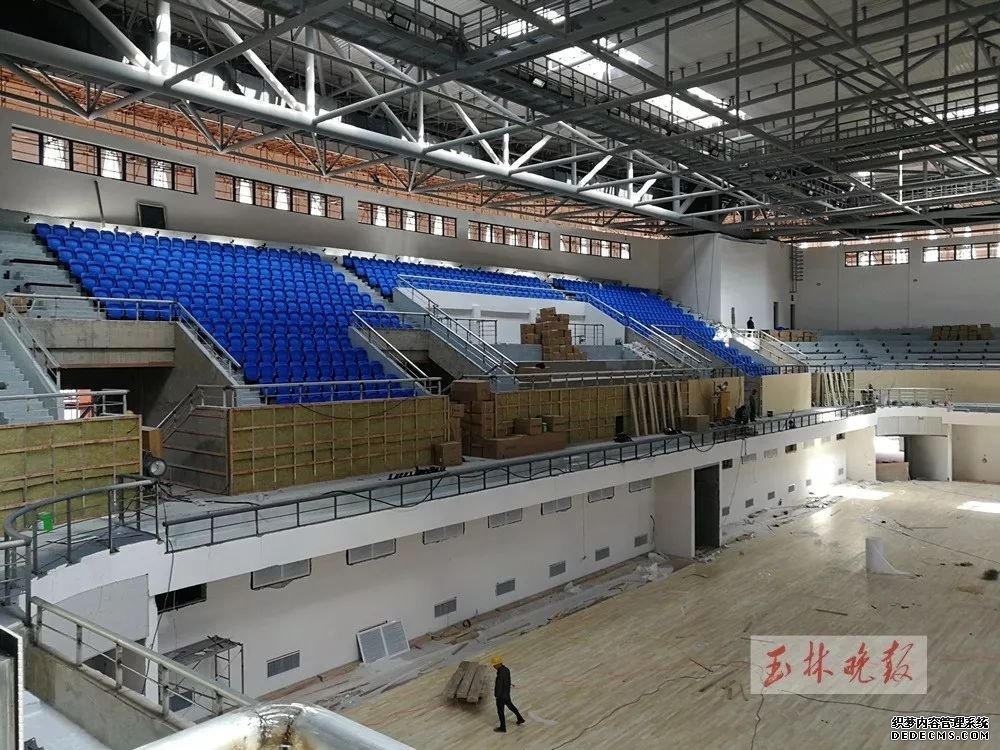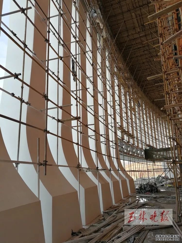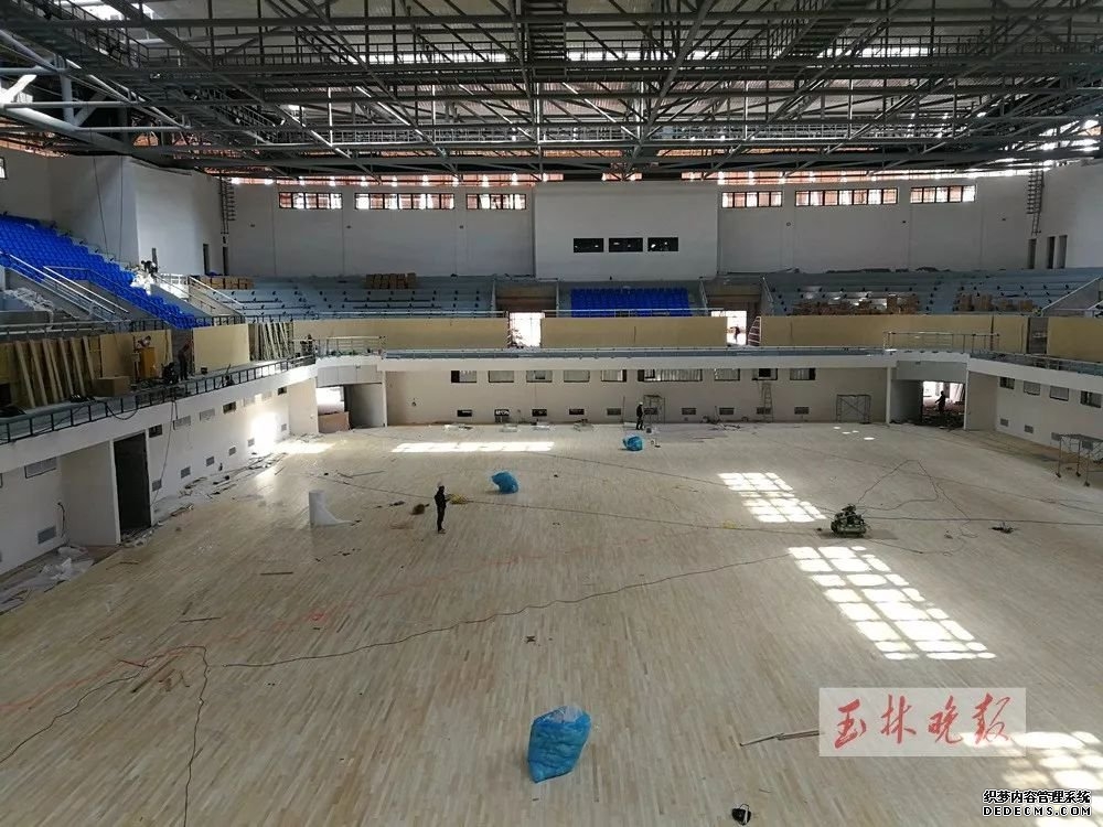 体育馆西门对面,是一个大型的体育广场,正在进行地面铺装、园路铺装、绿化种植和照明施工。体育馆南面是训练馆、游泳馆,主体工程均已完成,正在内部装修。