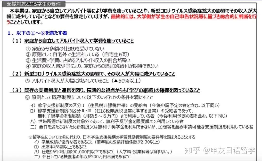 很多人都说日本的留学性价比很高,主要是因为在日本,除了法律严格保护的留学生打工许可外,各种学费补贴和学费减免以及种类繁多的奖学金制度,使得普通家庭的同学也能实现自己的留学梦。 对留学生的优惠政策: 1、各种充实的奖学金制度:日本的奖学金种类很多,概括起来有5种,即日本政府(文科省)的奖学金;日本民间组织的奖学金;日本地方公众组织的奖学金;一些高等院校创立的奖学金和自费留学生奖学金。 近年来,日本部分区市等地方自治也开设了奖学金。 2、学费减免措施:每年大概3万学生可以得到不同程度的学费减免,其中政府为私立大学或短期大学提供不超过学费的30%额度的补助。 3、医疗补助:在日本高等教育机构注册的学生,在其生病或发生意外伤害时,可享受80%的医疗补助。 4、公费录取:对即将升入研究生院的留学生和在研究生院或大学本科最高年级学习的留学生中,成绩优秀按照公费留学生录取;此外,留学生还可以获得每周28以内的打工许可。 在新一轮政府会议,日本政府出台具体的对象审查条件细则,又将发放对象扩大至留学生以及日语教育机构的学生,同时也将补助金的上限从10万日元提高至最多20万日元。 ![]() 属于以下3种状况的其中之一即可办理申请: 全额自付学费者 学生从父母那里没有或者很少收到经济援助者 原则上不与父母同住者(部分情况下即使同住也可酌情考虑) 生活费、学费占学生总体打工收入的比例较高者 由于家庭收入减少,因此难以得到来自父母的更多经济援助者 疫情之下收入骤减者 因为受到新冠疫情冲击,导致自身打工收入减少超过50%者。 希望与现有支援制度联合以及 长期来看能确保志望继续学习者 留学生&日语教育机构学生:按照日本学生支援机构的学习奖励制度为参考审查(※以下条件不一定都要满足,但部分院校会优先选择全部满足者) ■ 学习成绩优秀者(上一学年的绩点超过2.3) ■ 出席率超过80% ■ 每月父母经济援助不足9万日元(入学费用、授课费等不含在内) ■ 在日抚养者(养父母、亲戚等)的年收不足500万日元 从今年7月开始的针对因受到新冠影响而不能维持基本生活者的支援制度将进一步提高补助金额,并补充了更多的补助细则。部分符合对象的家庭有望获得最高30万日元的补助金。 ![]() ![]() ![]() (厚生劳动省官网简体字版译本) 今年7月伊始,日本政府就推出了针对贫困家庭的特别支援制度,支援金额为单身者6万日元/月,2人家庭共计8万日元/月,3人以上家庭共计10万日元/月。 随着疫情的蔓延形势,日本政府于最近的一次会议中决定将最长支援时间延长至6个月,并计划讨论将最高补助金额提高至30万日元/月。 此外,在日本政府和执政党的经济对策中,对于持有my number 卡的在日居住外国人&留学生还会给予相当于每人2万日元的积分卡。 这些奖学金政策有帮助赴日留学生大大减轻了资金压力,为了更好的帮助国内学生申请日本留学,申友日语留学特整理出:【日本留学手册大礼包】,包含“日本留学扫盲图”、“日本留学申请方案概览”、“日本留学申请指南”以及“日本留学生考试(EJU)详解”等资料 ↓↓↓↓↓↓领 ![]() |