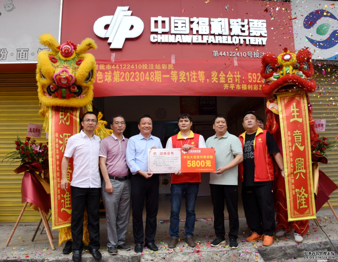 4月9日,开平市赤水镇福彩第44122408号投注站中出“双色球”游戏第2023039期一等奖890万元。一个月内江门两中“双色球”大奖,幸运降临! 5月2日上午 江门市福利彩票发行中心到开平市 举行庆祝中大奖宣传活动