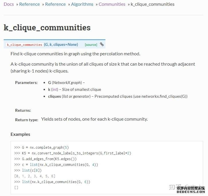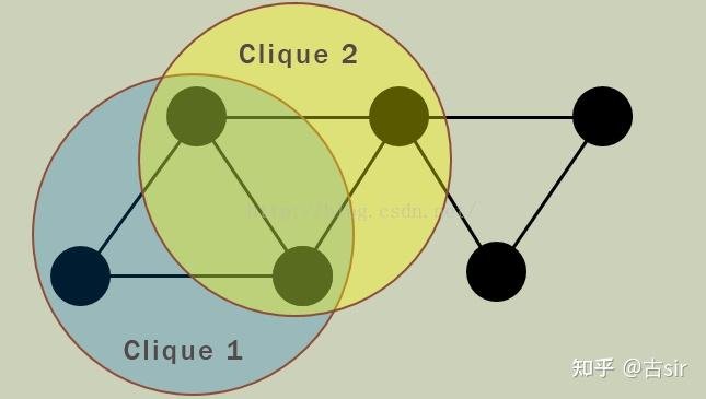 对于一个图G而言,如果其中有一个完全子图(任意两个节点之间均存在边),节点数是k,那么这个完全子图就可称为一个k-clique。 进而,如果两个k-clique之间存在k-1个共同的节点,那么就称这两个clique是“相邻”的。 彼此相邻的这样一串clique构成最大集合,就可以称为一个社区(而且这样的社区是可以重叠的,即所谓的overlapping community,就是说有些节点可以同时属于多个社区)。 下面前两张图表示两个3-clique形成了一个社区,第三张图是一个重叠社区的示意图。 ![]() ![]() ![]() 在NetworkX中可以直接调用clique渗透算法(且是唯一一个用于社区发现的算法),使用文档如下: ![]()