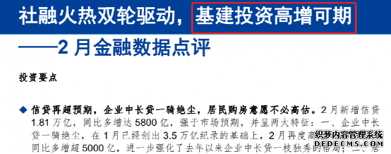 建筑央国企价值重估正当时? 从业内分析来看,今年前两月建筑央企的超预期表现或不是短期现象,而是有望贯穿全年。 浙商证券分析师匡培钦、陈依晗认为,短期看,当前出口受国际环境影响有所承压、房地产市场风险隐患较多、消费复苏仍需观察,因此基础设施投资稳定增长对当前扩大国内需求、应对经济下行压力具有重要作用。而长期看,重大项目的开工建设对稳增长、稳就业、保民生均具备重要保障作用,既利当前、又利长远,“我们认为2023年尤其是上半年基建投资仍系稳住经济大盘的主要抓手”。 华金证券分析师张仲杰亦表示,社融火热双轮驱动,基建投资高增可期,有效投资带动就业机会的增加,或构成中低收入群体收入增长的主线政策路径。“我们倾向于上修全年基建投资增速预测至8%左右,结构上以先进制造业促进型的新能源等新型基建更受银行欢迎,城建、交通等传统微利领域的基建投资则更加依赖专项债转为资本金、以及政策性开发性金融机构的直接支持”,张仲杰称。
