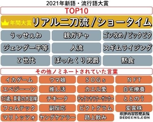 日本2021年十大流行语公布 日本2021年的“新语・流行语大赏”于12月1日发表。年间大赏为「リアル二刀流/ショータイム」,是北美四大职业体育联盟之一,MLB(美国职棒联盟)2021年度赛季最有价值球员(MVP)得主,日本男子职业棒球运动员大谷翔平关联的词语。