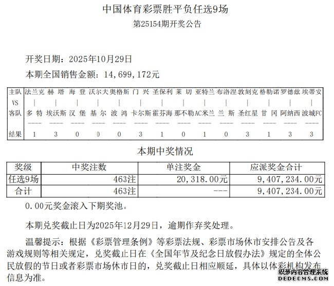任九开奖北京时间10月29日,胜负彩第25154期任九开奖结果揭晓。本期任九开出463注,单注奖金20,318元。本期任九投注总额为14,699,172元。